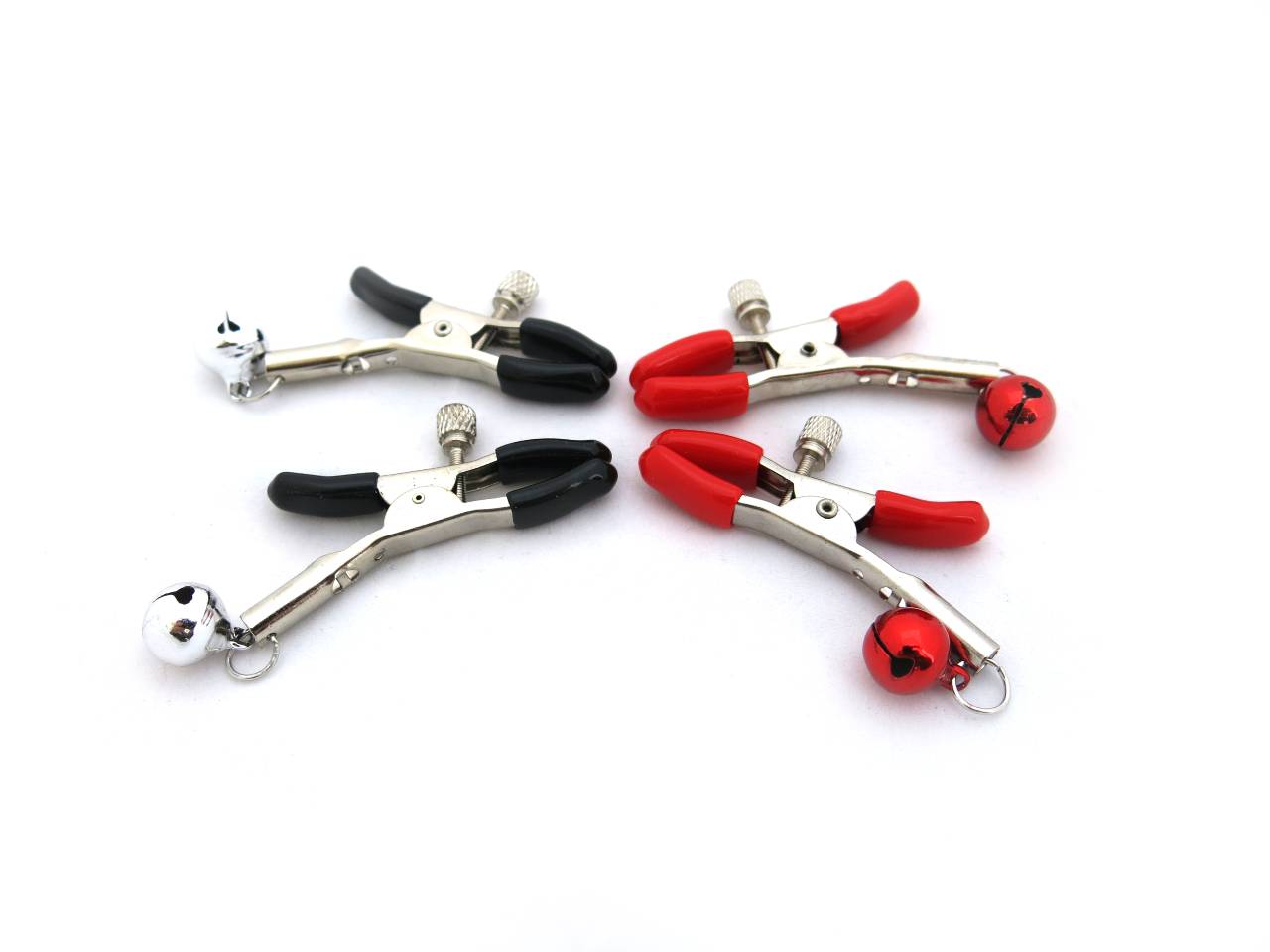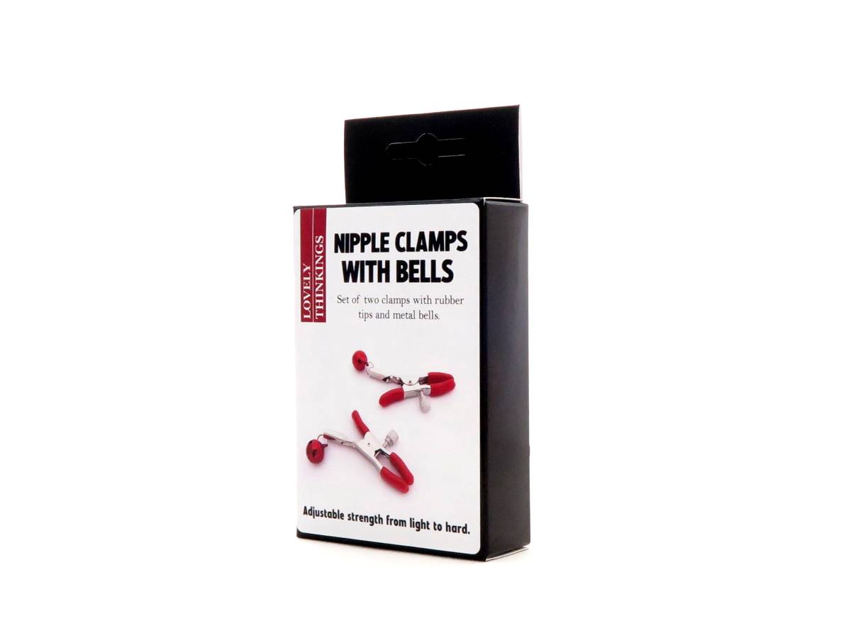 Set of two nipple clamps with bells with rubber tips to protect the clamped nipples. The intensity level can be adjusted with the attached screw cap, so you can start your play slowly and gently then increase the intensity as you are ready.