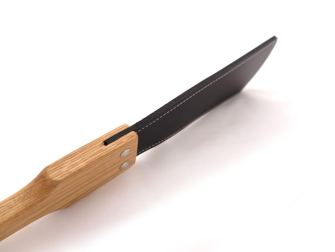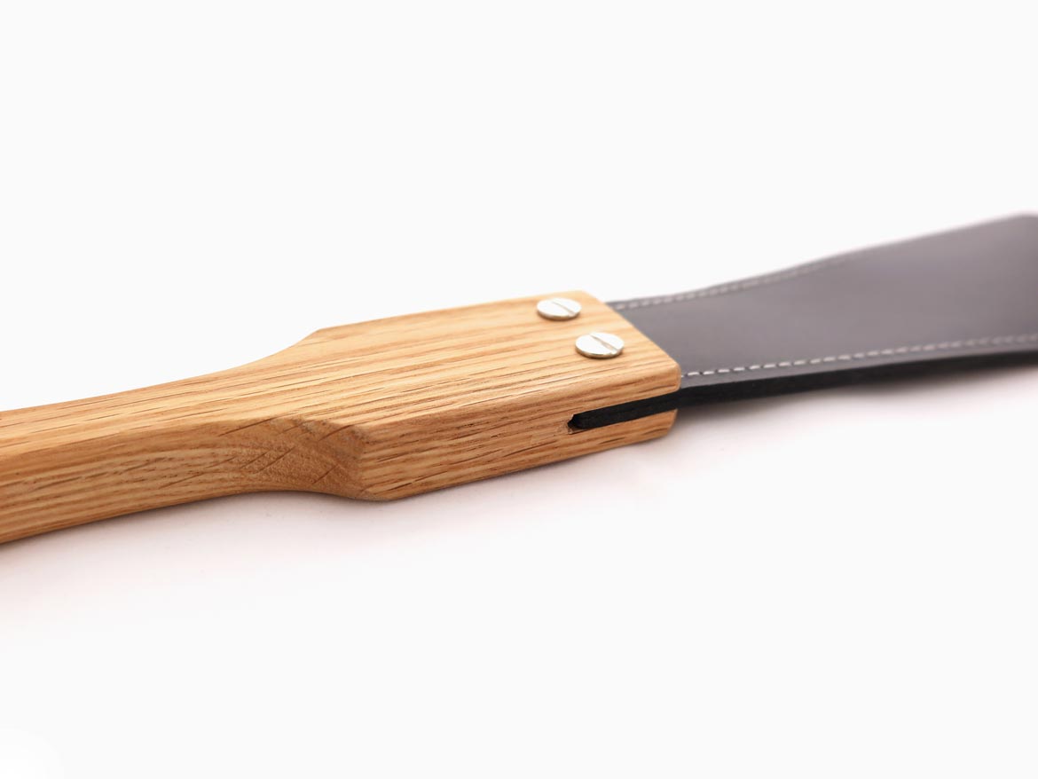 This BDSM paddle is one of the finest pieces of our collection. With it’s wide leather flap, this paddle gives a nice sound. Given of course by the two layers of buffalo leather that add extra thickenss to the flap. These layers are sealed together and reinforced with elegant white stitching around the edges. Both wood and leather are varnished for a shiny look and protective surface.
