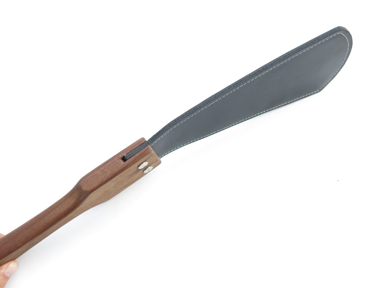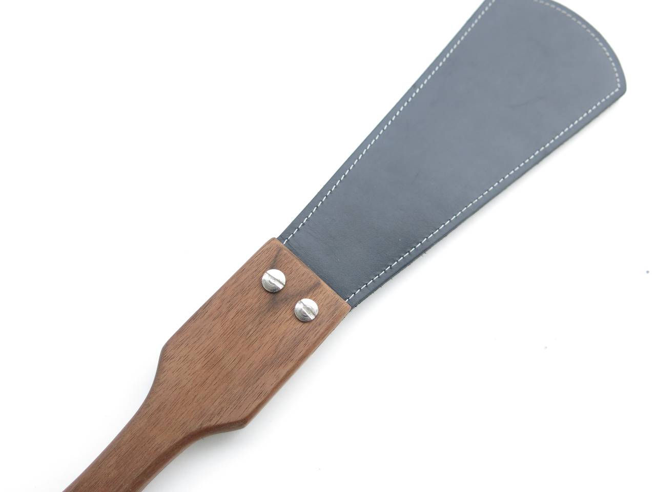 This BDSM paddle is one of the finest pieces of our collection. With it’s wide leather flap, this paddle gives a nice sound. Given of course by the two layers of buffalo leather that add extra thickenss to the flap. These layers are sealed together and reinforced with elegant white stitching around the edges. Both wood and leather are varnished for a shiny look and protective surface.