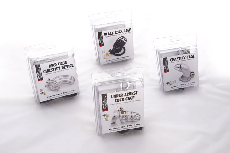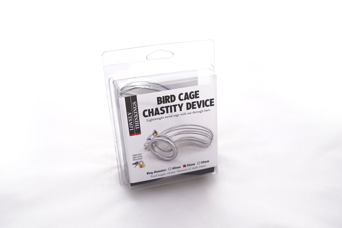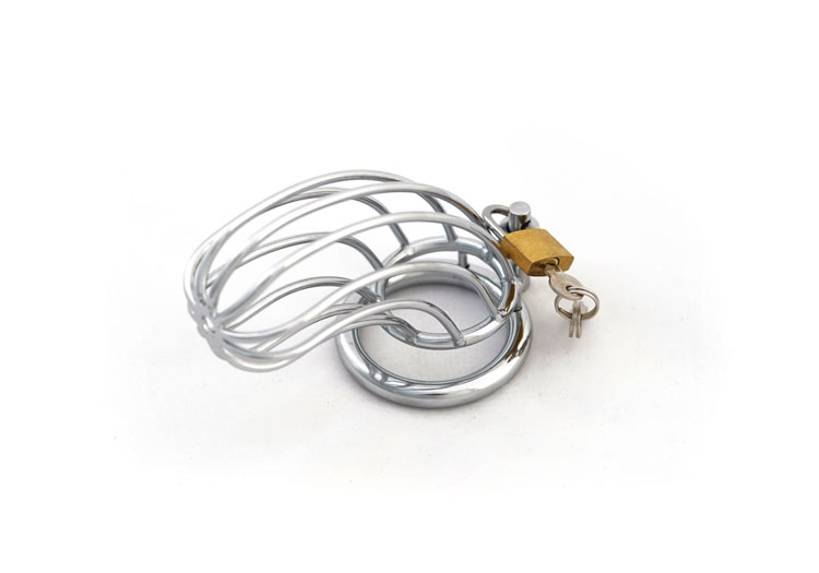 Our bird cage male chastity device has slender metal bars wrapped to form a delicate cage for the male submissive. Made from lightweight metal to lock the cock for an extended period of time, particularly suitable for those who wish to give away the key. Used to prevent a complete erection, for chastity play and for men who enjoy the dominance and control of a femdom (or male dom!). Comes with lock and key.