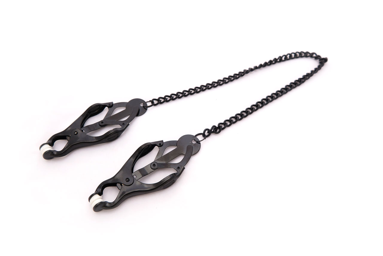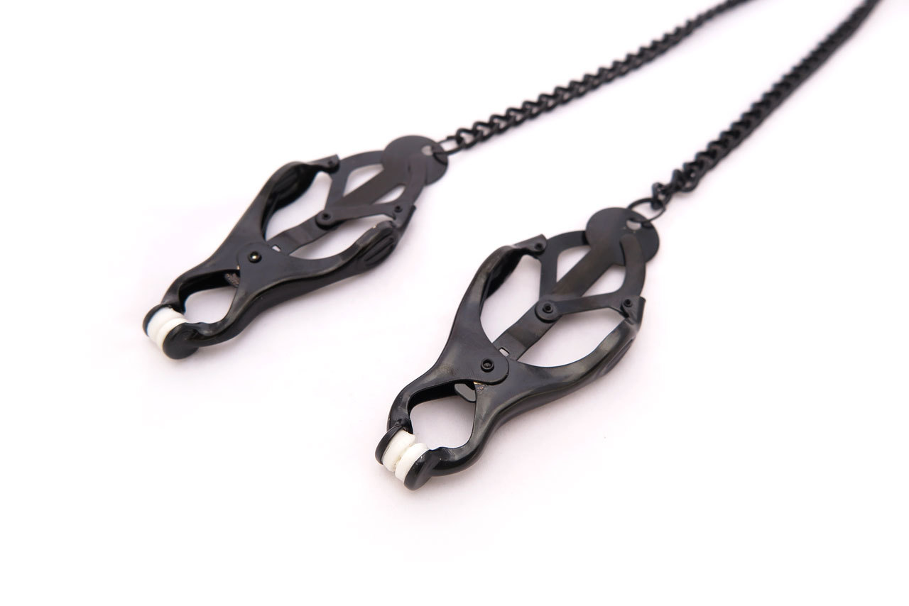 The Japanese clover clamps have a beautiful detailing and large shape for those who like to show off their curves with big jewelry and adornments. The nipples are grabbed from a horizontal direction, preventing the clamps from slipping off the nipples with their extra weight. Textured rubber tips give extra sensation to the nipples.