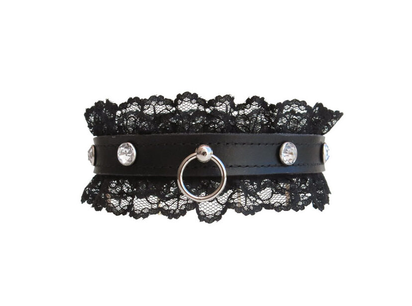 Say hello to leather and lace! This sexy bdsm collar from our premium leather collection is made from soft and supple leather and black fabric lace edging. The suede interior makes this collar soft on the skin and the stitched edges add a refined and elegant final touch. Adorned with clear gems for decoration and an o ring to attach a lead for light tugging.