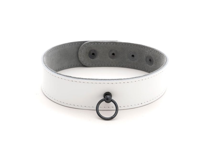White leather collar with black hardware and soft suede interior lining. Adjustable fit with snap closure at the back. Made in the EU.