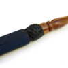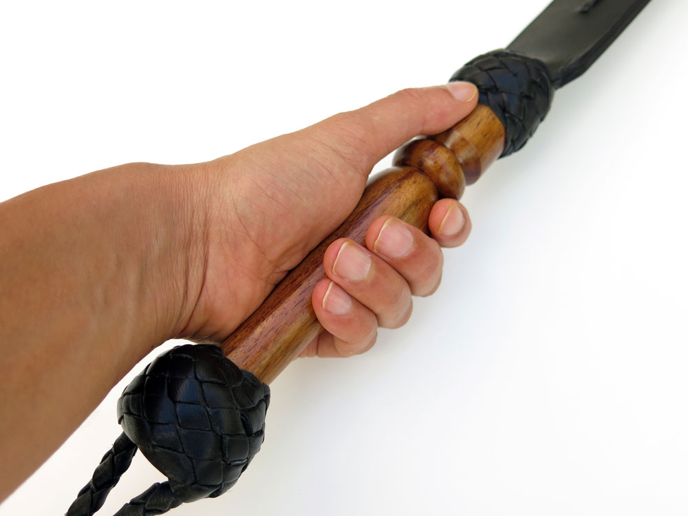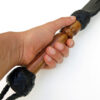 - Braided leather around a dark wooden handle.