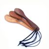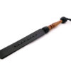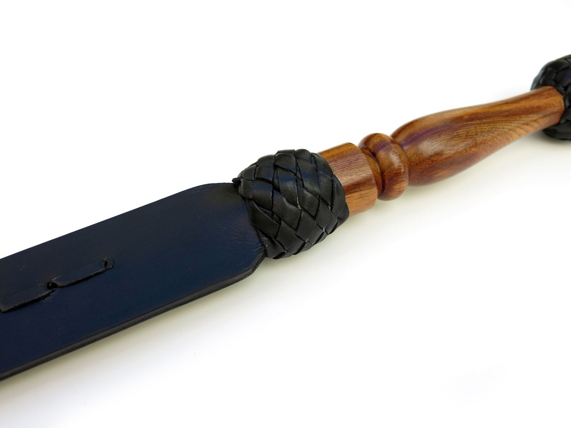 This long leather paddle has two wide and strong leather flaps, braided together beautifully down the center. With a division at the tip between the two leather flaps, this paddle also acts similar to a discipline tawse and has a heightened sound when smacking. The leather itself has a thickness of 0.8cm and width of 5cm, providing the right balance of surface area for control and coverage. The dark wooden handle is wrapped and braided with leather on either end for a smooth transition into the spanking paddle. A leather handle loop makes for easy hanging on the wrist during use. Recommended for medium impact.