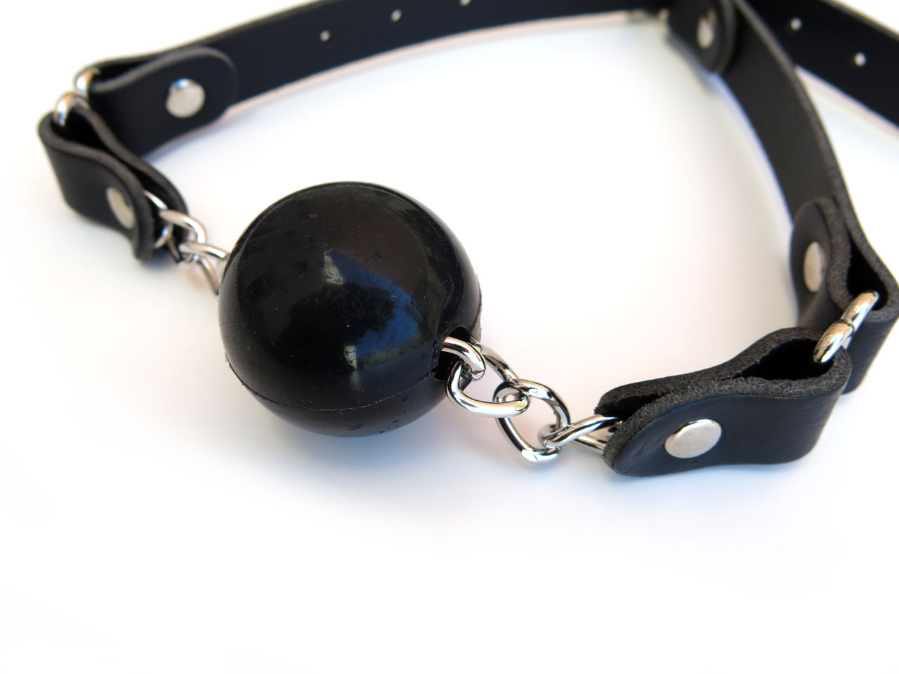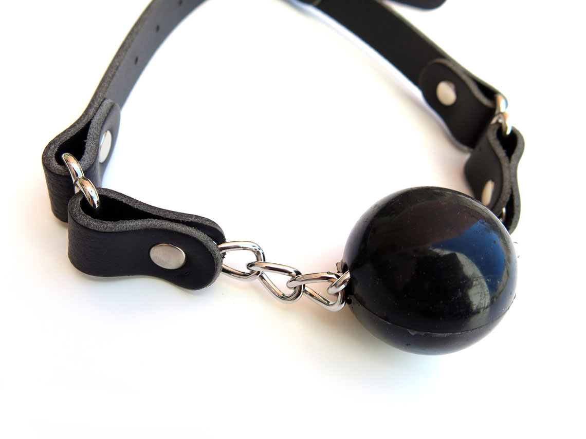Leather ball gag with solid silicone ball and leather straps with buckled closure. Black ball is 3.5cm in diameter, slightly smaller than industry standard, allowing for these restraints to be used for a longer time with less tension on the jaw.