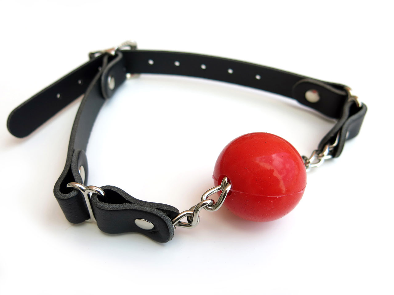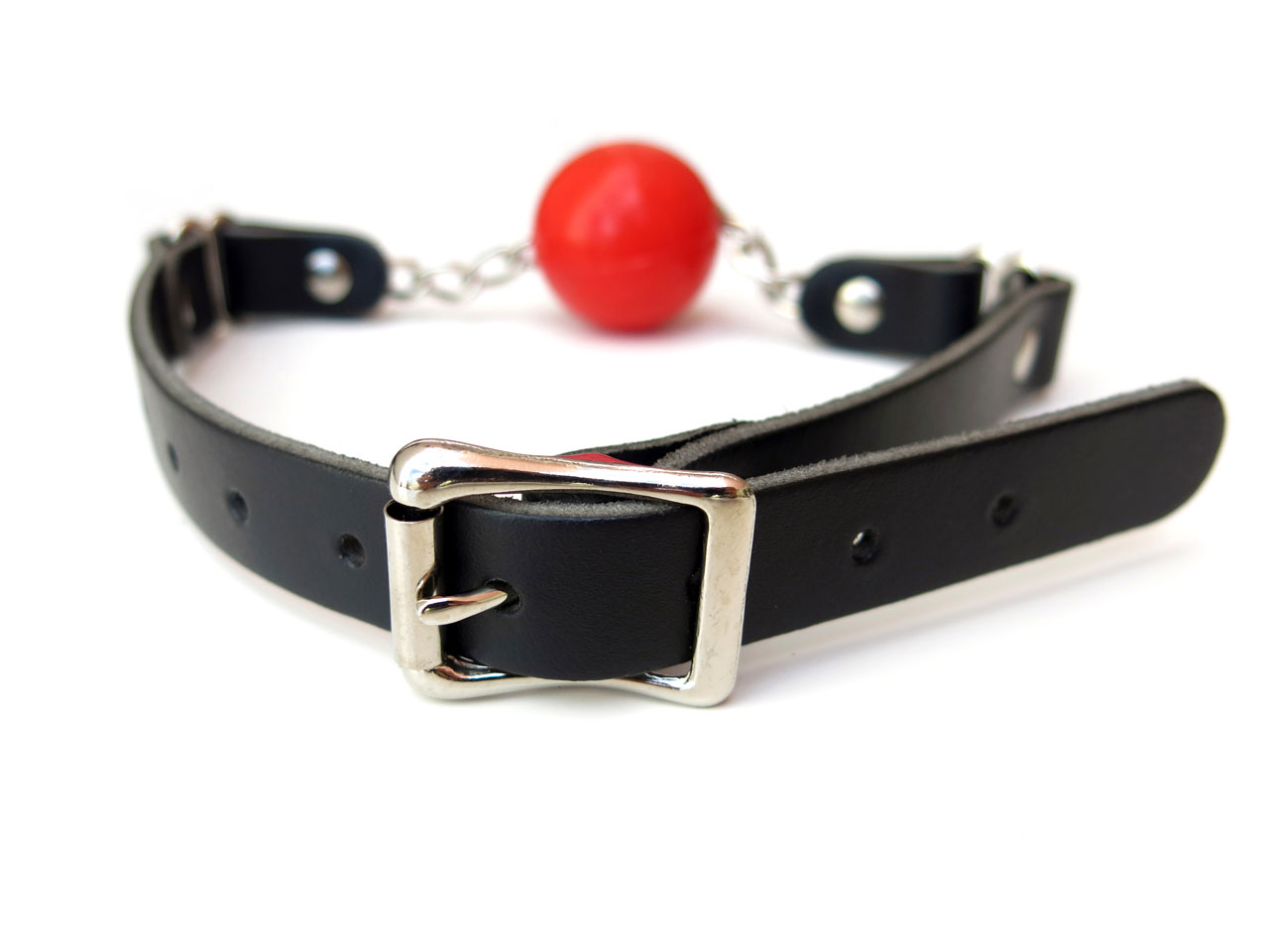 Silicone ball gag with solid silicone and leather straps with buckled closure. Red ball is 3.5cm in diameter, slightly smaller than industry standard, allowing for these restraints to be used for a longer time with less tension on the jaw.