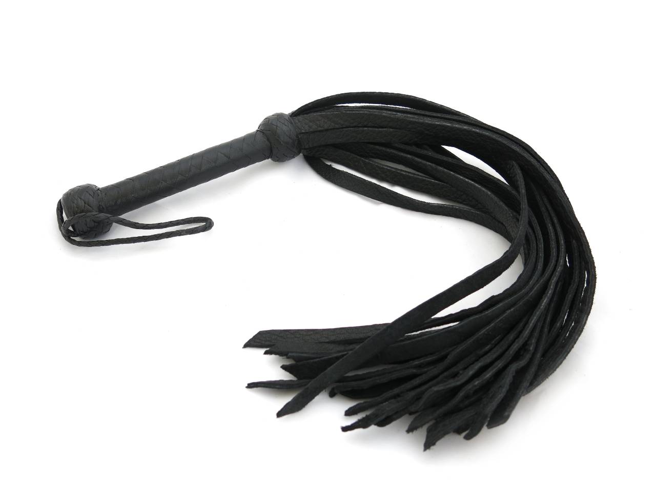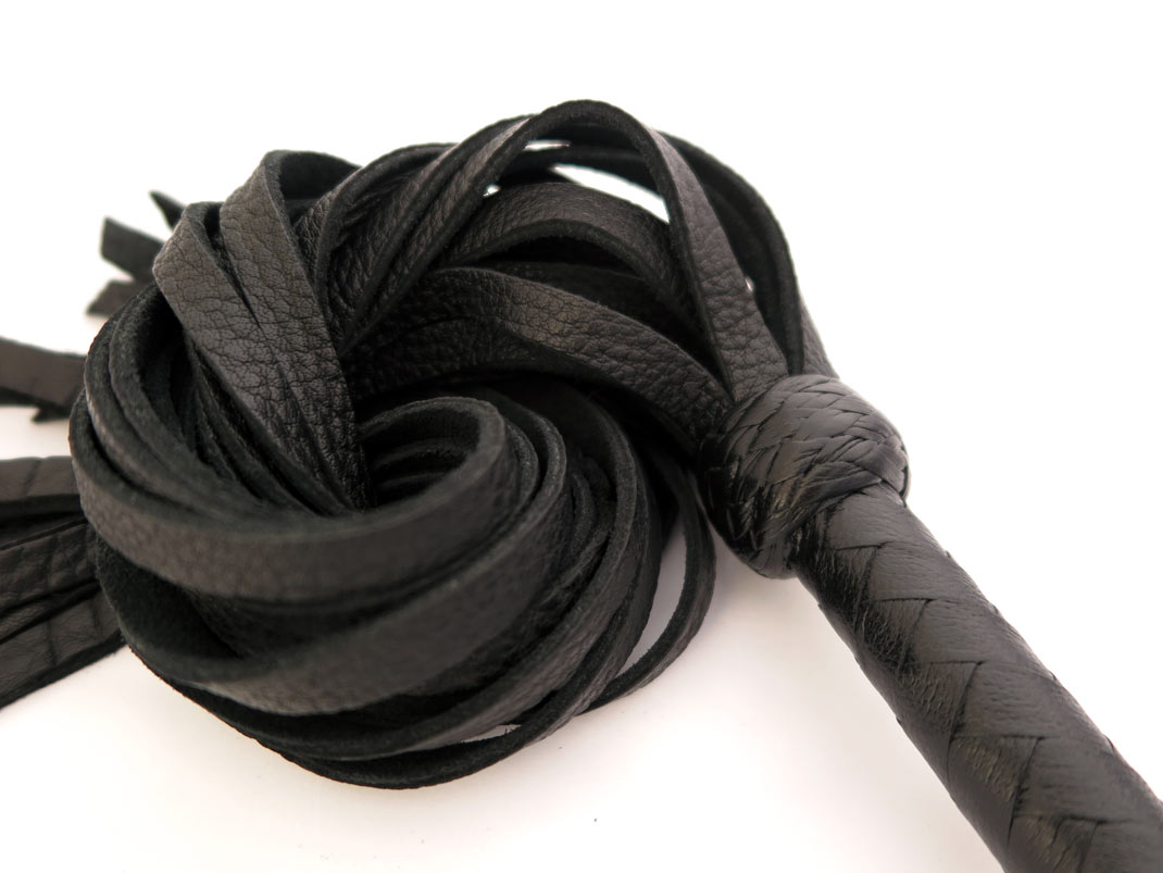 This buffalo flogger is a professional piece made with twenty soft leather tails. Weight in the handle provides balance for ease of use and pressure on the wrist. A substantial thuddy flogger with significant weight, this piece is best used for medium to high impact.