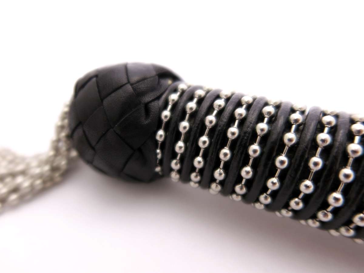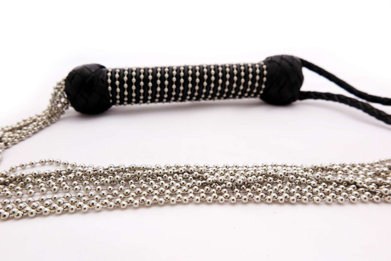 This kinky chain tail flogger is made with 12 steel tails that wrap around a leather handle. We recommend using this metal flogger for sensation play or light impact, offering a tool used by both beginners or advanced players. Whether you are looking to explore something new or to have a unique piece in your collection, this flogger serves.