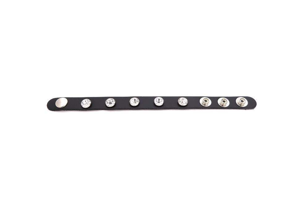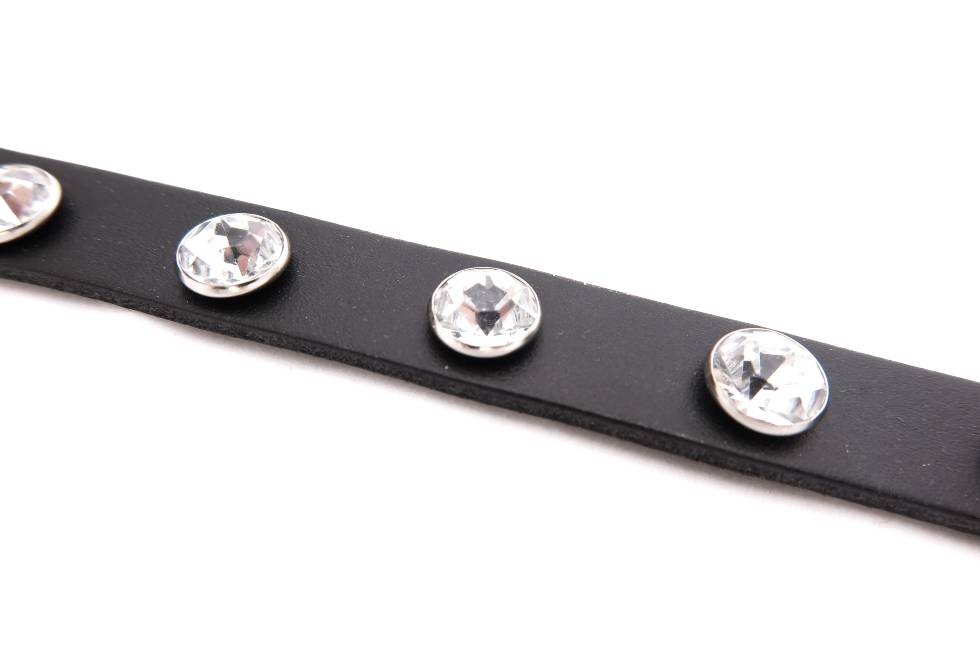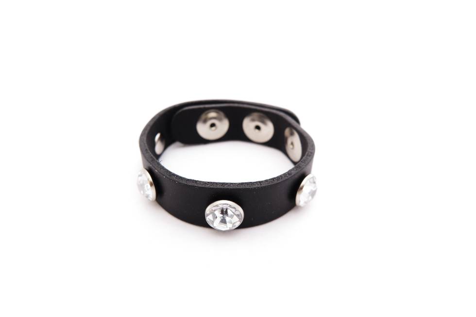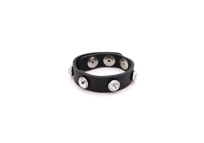 Adjustable cock ring in leather with three snap adjustments. Leather is soft and supple for a comfortable and elegant fit around the penis and scrotum. The simple leather strap always remains a classic, while five acrylic gemst add more fun to your play. This cock ring with spikes is surely a unique piece for your collection.