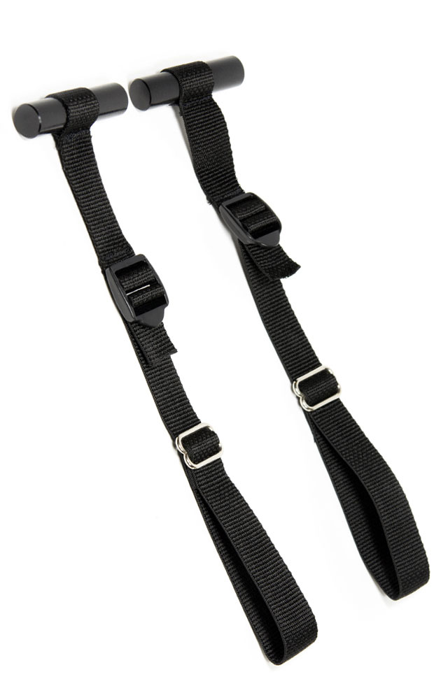A set of two black tether cuffs and door stoppers to place above and over the door. A quick way to suspend your submissive in home without need for any extra hardware or equipment.