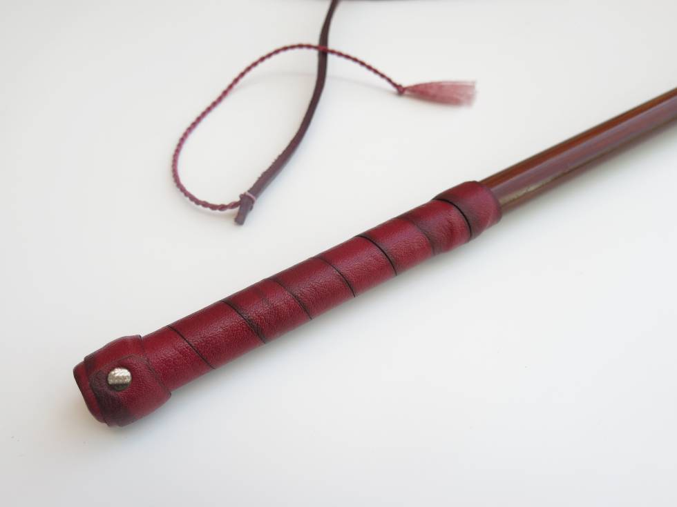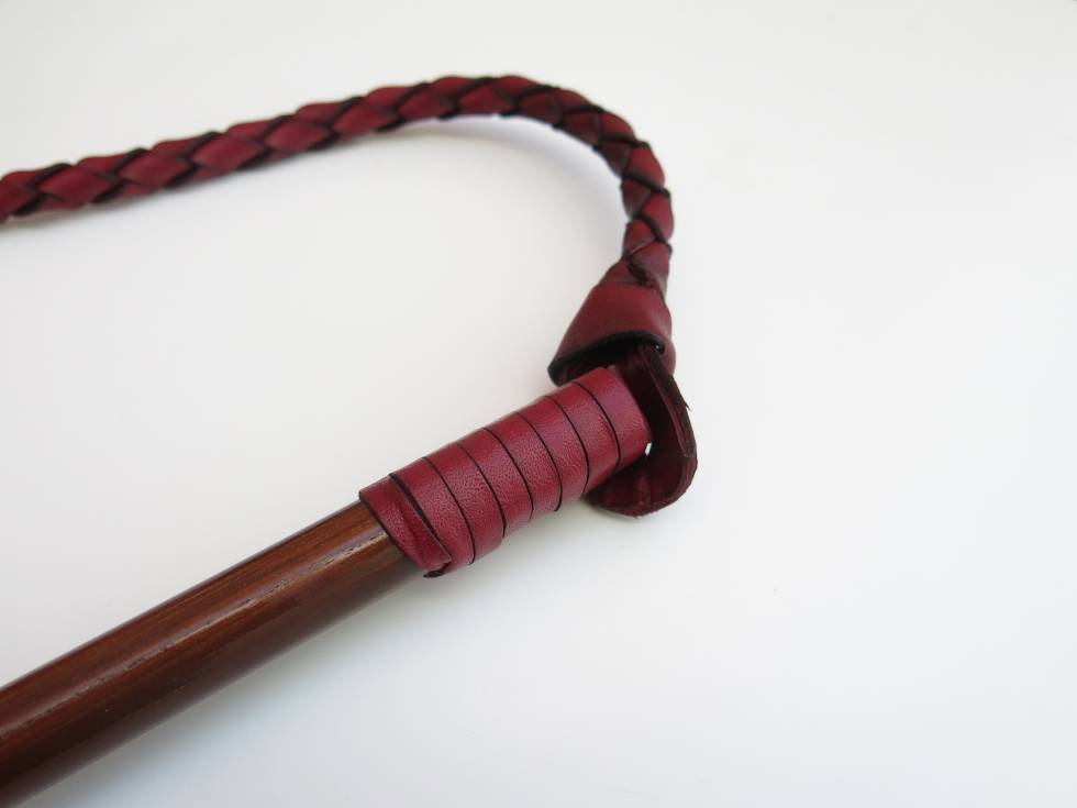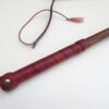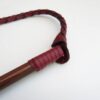Single tail whip with a lightweight wooden handle. Burgundy coloured.