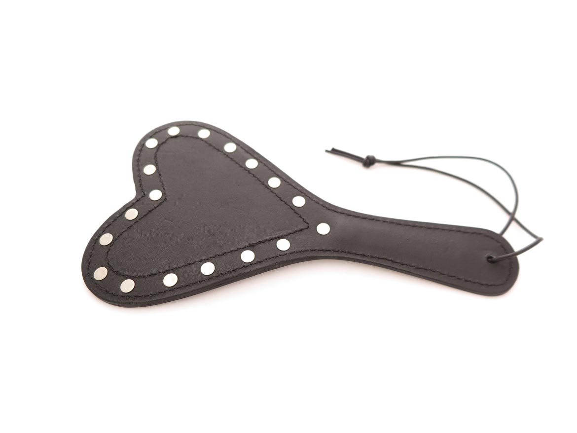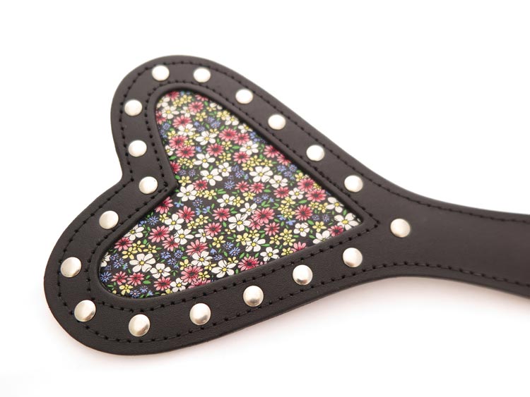 Heart shaped leather paddle for your sweet spanking needs. Soft flowery design in the center with the edges decorated by steel rivets. A perfect balance between hard and soft. An all round paddle for medium to high intensity with the comfort of supple yet strong leather. Compact and handheld size with black stitching around the edges. The sweet heart shape makes this piece even more fun or suits as a tender gift for your partner.