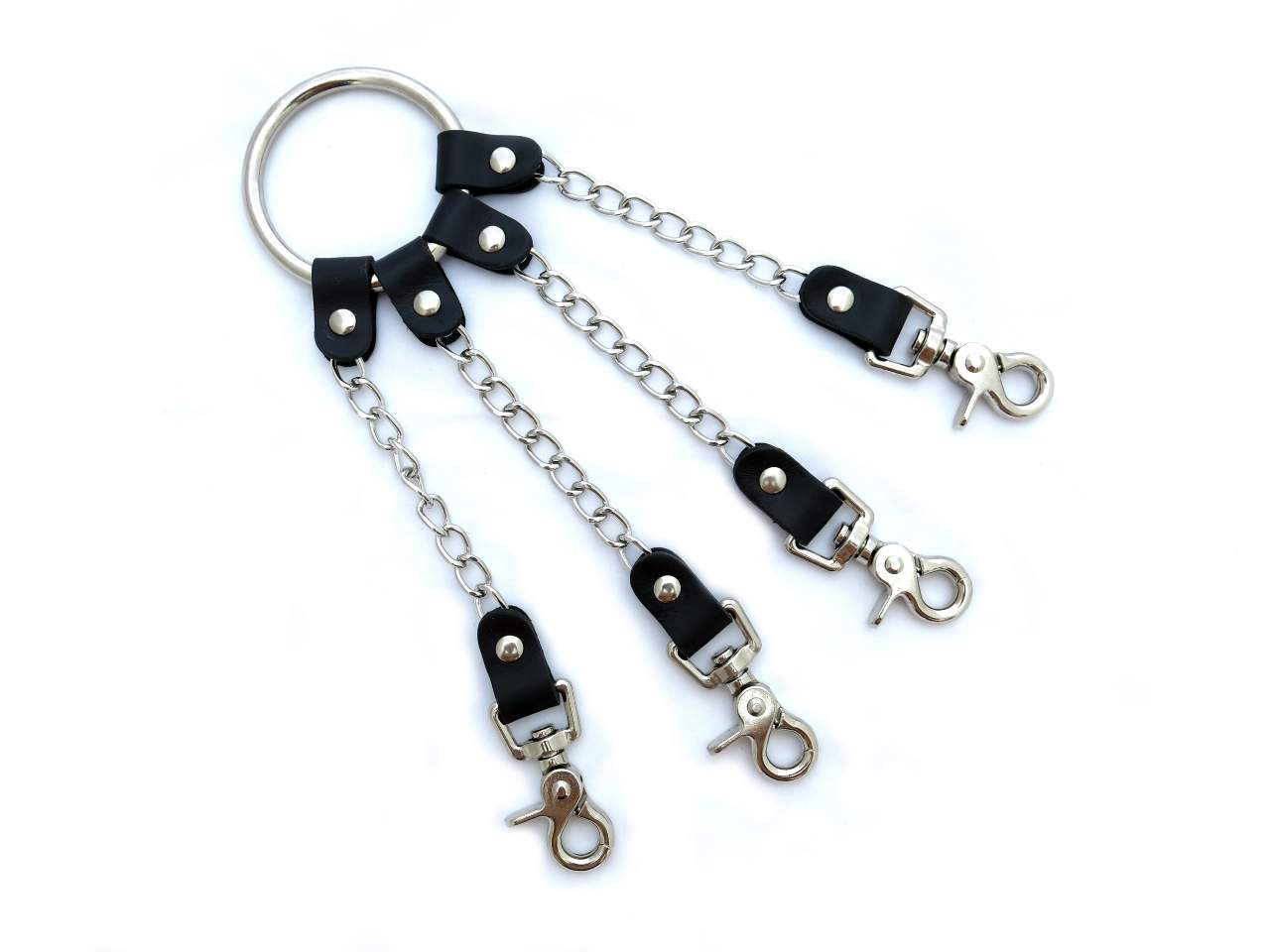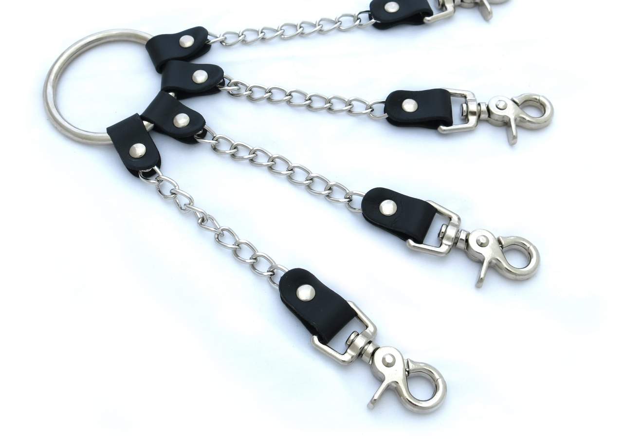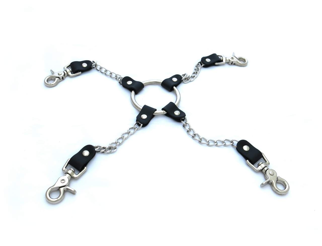 Four way hog tie connector to attach to wrist and ankle cuffs. This bondage cuff connector is made with a large 6.5cm diameter ring, chain and leather attachments to high quality, swivel trigger snaps. Perfect for quickly putting your partner or submissive into restraint without loosing the heat. A must for any bondage set.