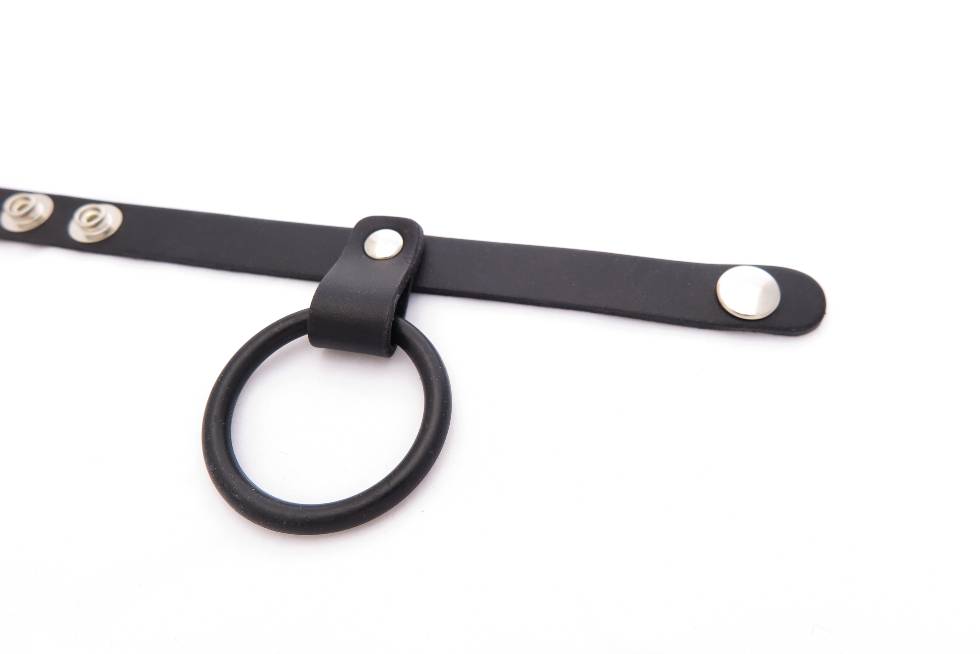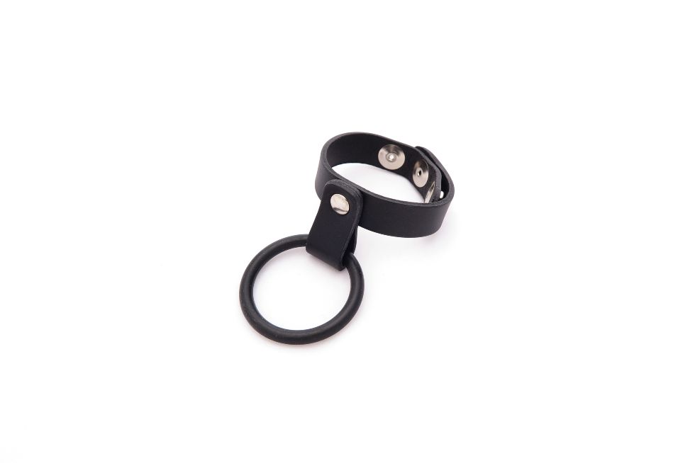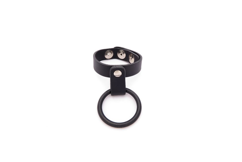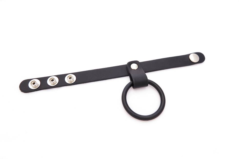 Double cock ring for penis and balls. Adjustable leather strap fits around the scrotum, while the rubber ring remains on the shaft.