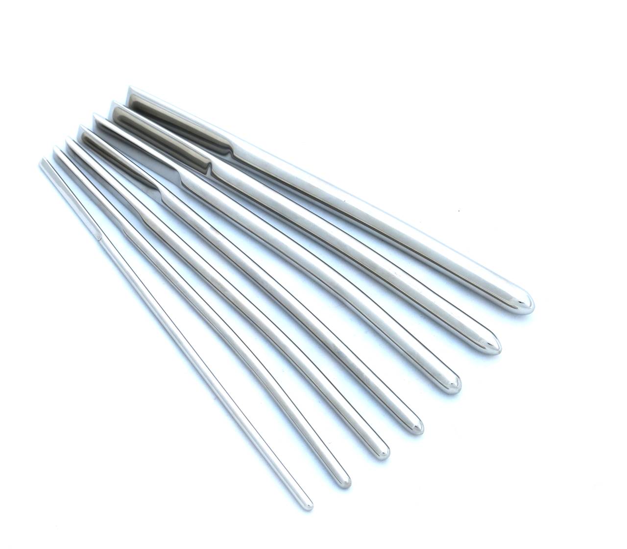 Urethral sounding is a relatively new kink where a stiff rod is gently placed inside the urethra to experience pleasure and sometimes stimulate the male prostrate. Our hegar dilators are made with 100% solid and medical grade stainless steel. Therefore, they are the ideal material to ensure safety and effectiveness of urethral sounding. With a long stem and smooth finish, their design allows you to explore slowly and comfortably. The opposite end has a flat tip for easy grip and to avoid slipping. Available in ranges from 4mm to 10mm rods, so that you can play at your own level.