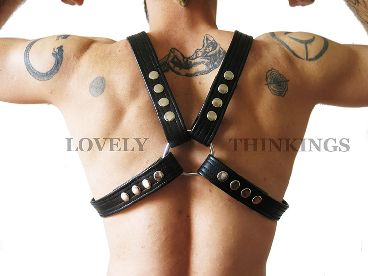 Professional men’s leather chest harness or bondage harness for BDSM or festival wear. With two layers of genuine leather, this piece makes a statement with thick and wide straps, while comfortably fitting on the skin. Adjustable sizing with easy to use snaps.