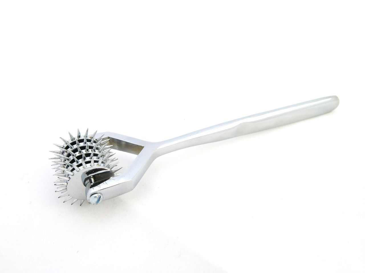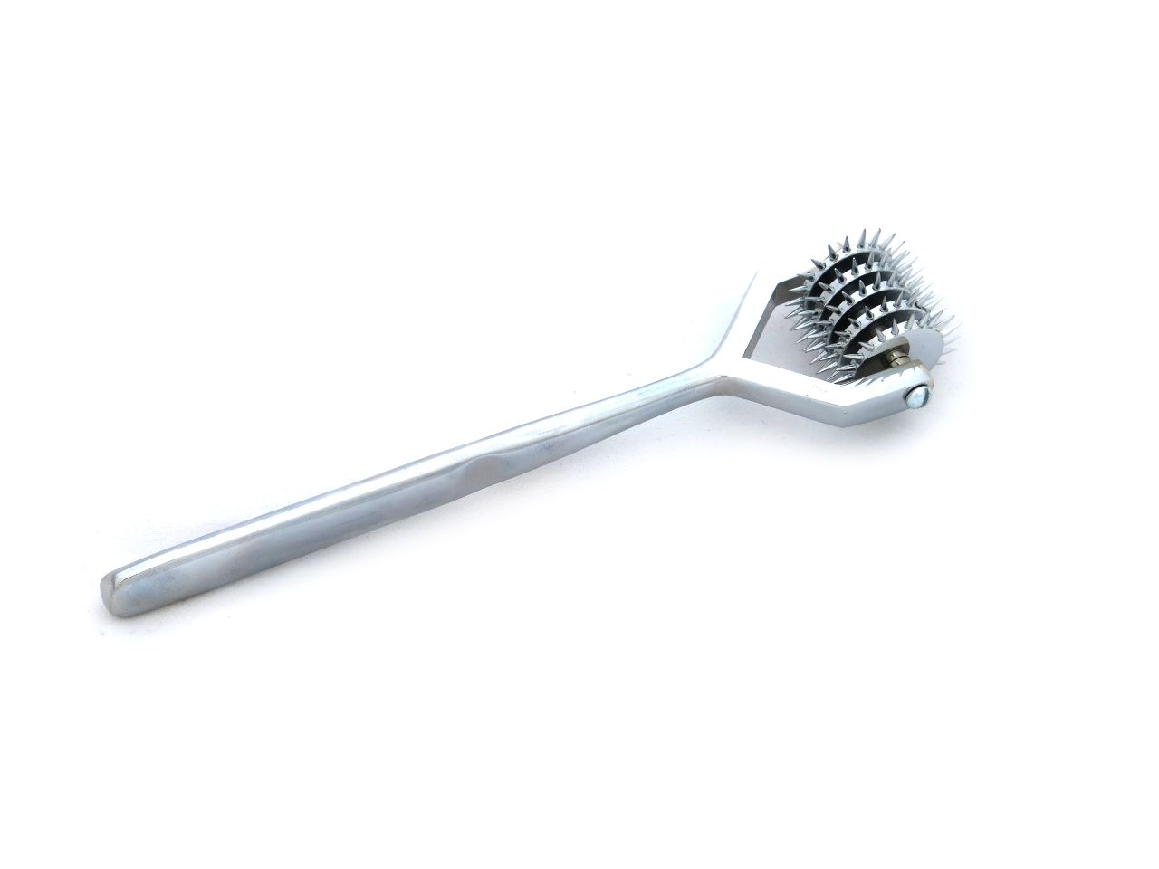 A high quality, solid stainless steel Wartenberg wheel with five spiked roller heads. Sharp spikes deliver unique sensations to work sensitivity on the skin and send shivers throughout the whole body. This kinky toy is often used to introduce BDSM play.
