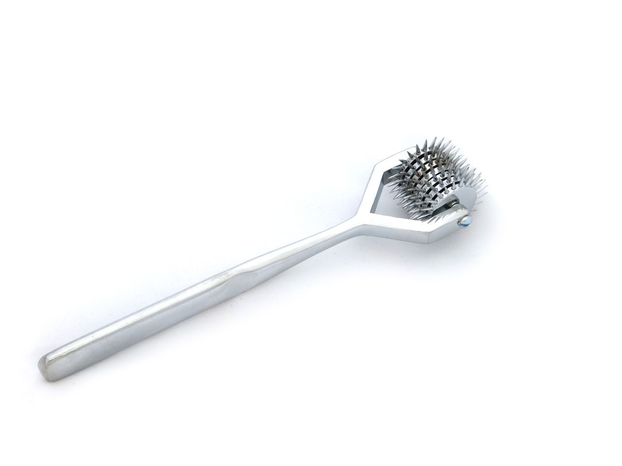 A high quality and solid stainless steel Wartenberg pinwheel with seven spiked roller heads. Sharp spikes deliver unique sensations to work sensitivity on the skin and send shivers throughout the whole body. This kinky toy is often used to introduce BDSM play.