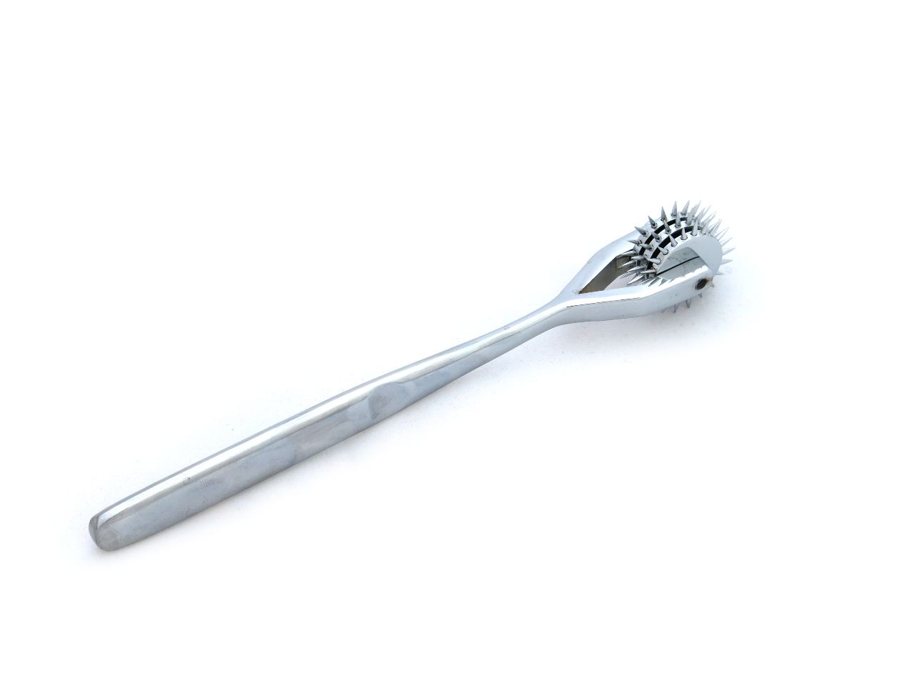 A high quality, solid stainless steel pinwheel sex toy with three spiked Wartenberg heads. Sharp spikes deliver unique sensations to work sensitivity on the skin and send shivers throughout the whole body. This kinky toy is often used to introduce BDSM play.