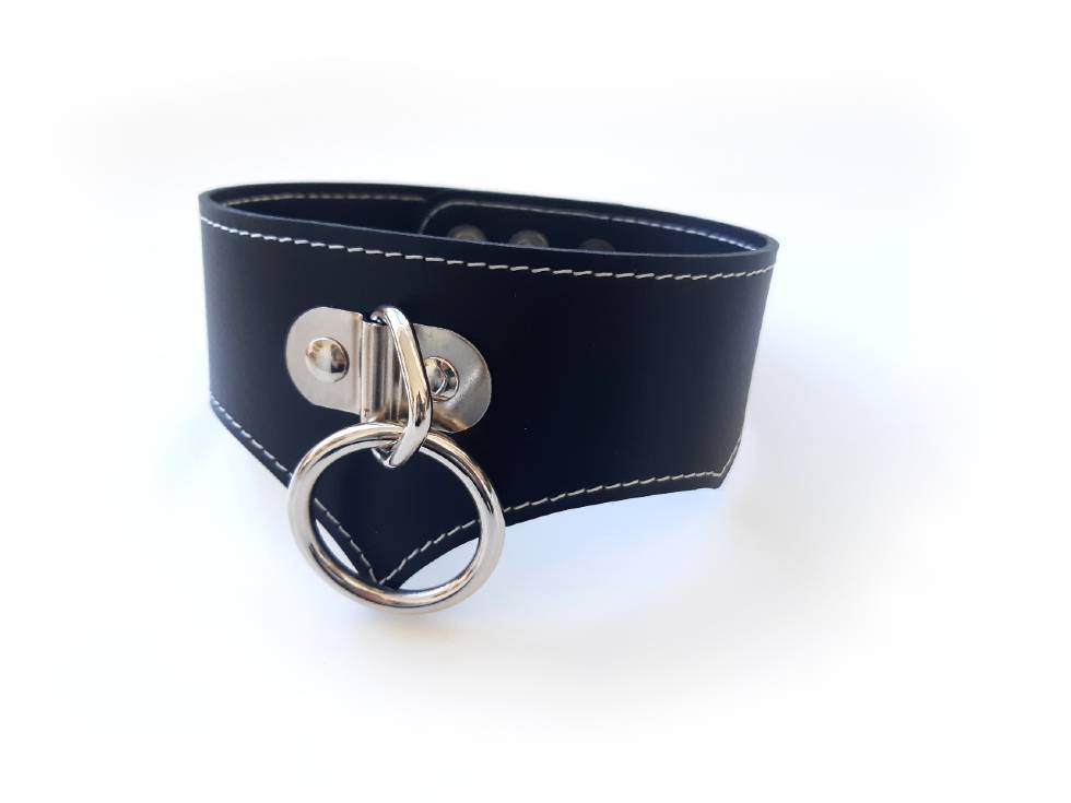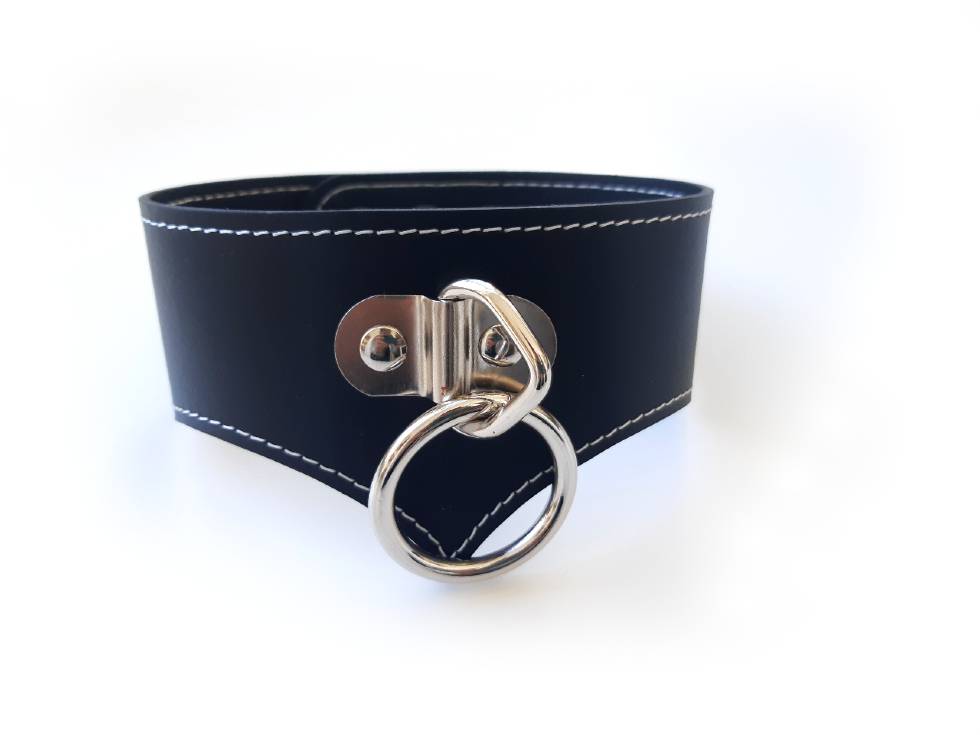 Our black leather posture collar is made with premium quality leather to embellish your submissive. A large metal ring sits on the front to attach leads, other hooks or to simply have the slave look.