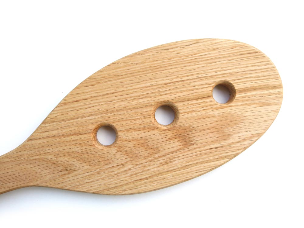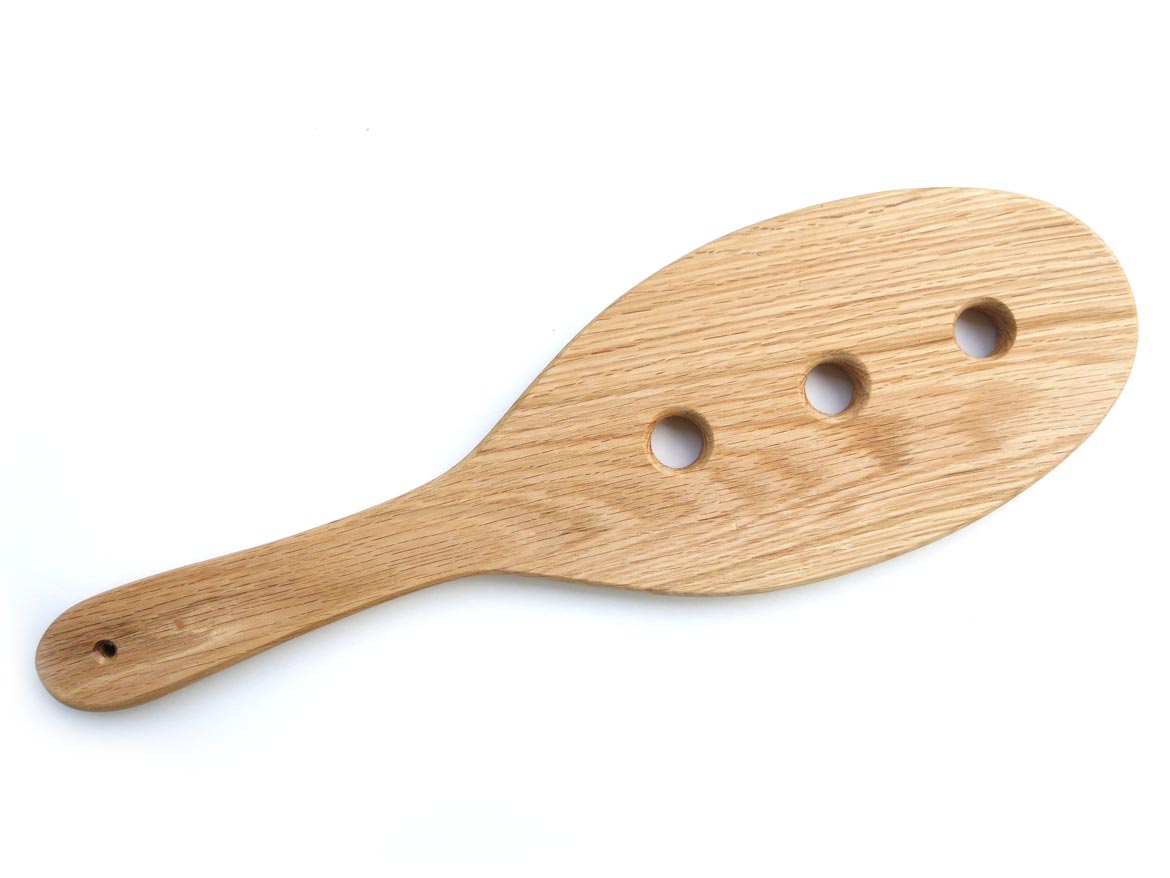 This wooden spanking paddle is made with three interior holes to give less resistance and more pain. The air moves easily through the spaces in the paddle for faster and harder smacking. Handcrafted and made in Canadian oak wood, this is a unique piece directly from our collection. Varnished with oil for a shiny finish and protective surface.
