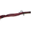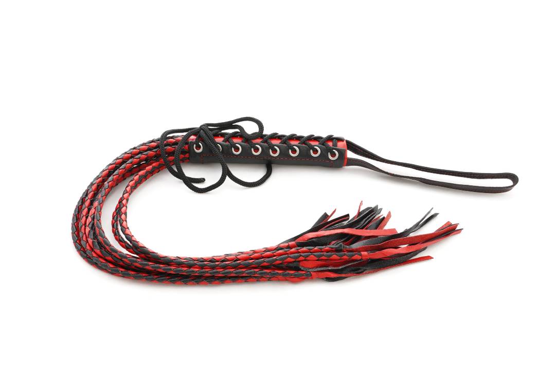 Leather flogger with 8 braided falls, interwoven between red and black leather. A tressed handle adds a gothic dungeon look.