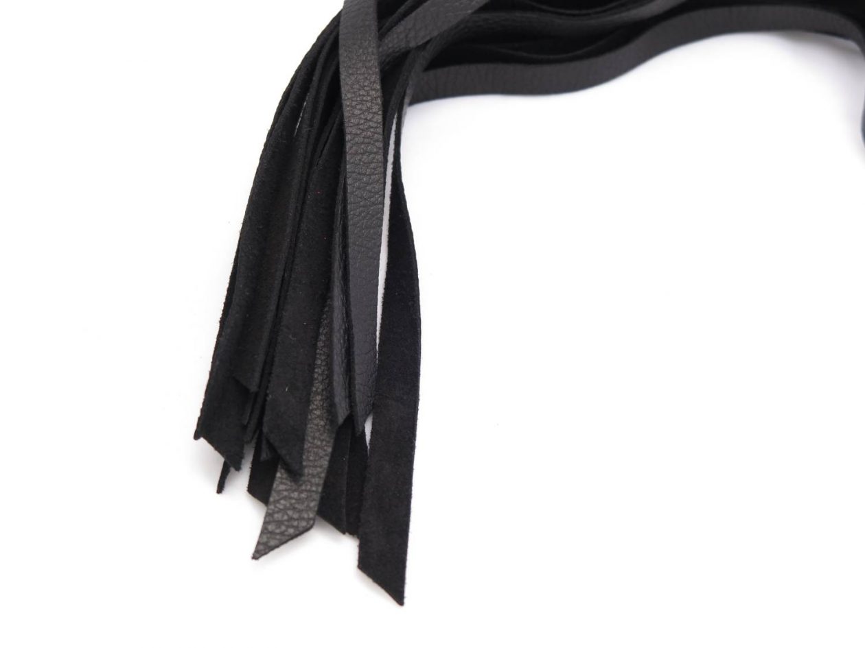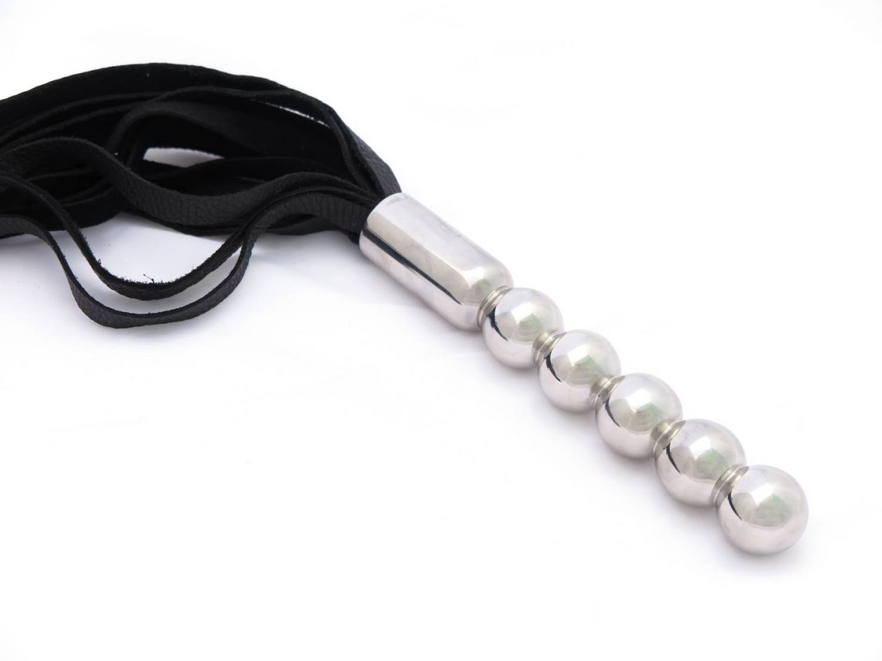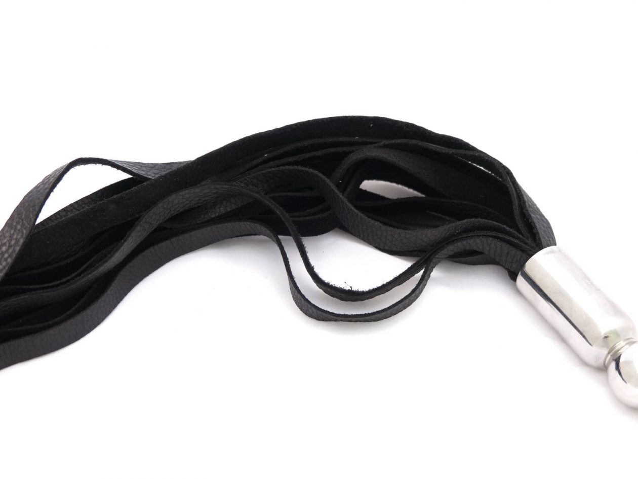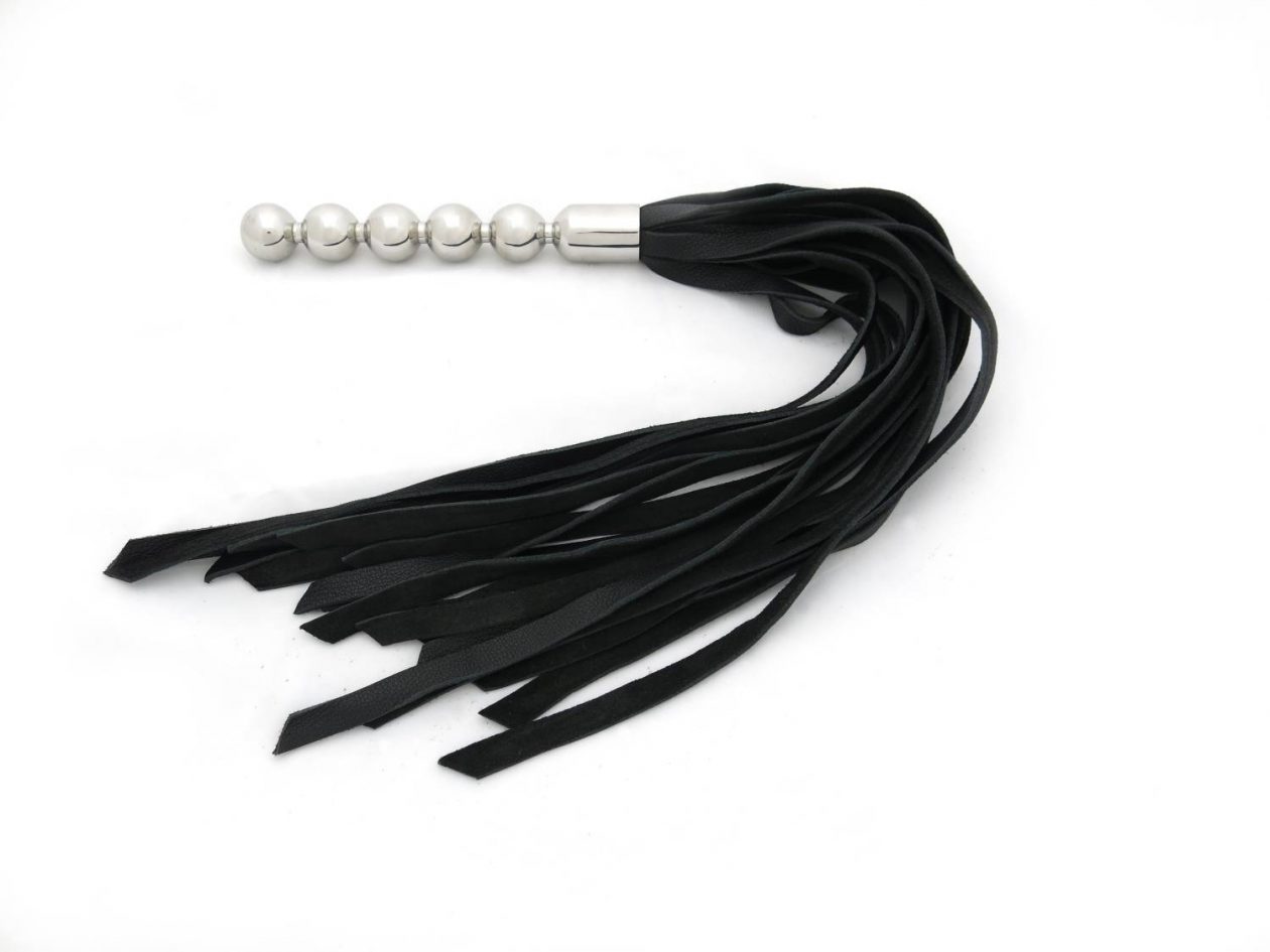 Professional cow leather flogger with stainless steel, ribbed handle. This piece is for the advanced players, with 20 strong cow leather tails for heavy weight and maximum impact. Solid stainless steel handle also provides balance and adds weight. The unique ribbed design of the handle and its body safe material offer another layer of exploration as a dildo. This is a serious flogger for those with intense fetishes who prefer to play in style.