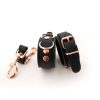 Rose gold hardware gives a shiny pink touch to contrast against the black leather.