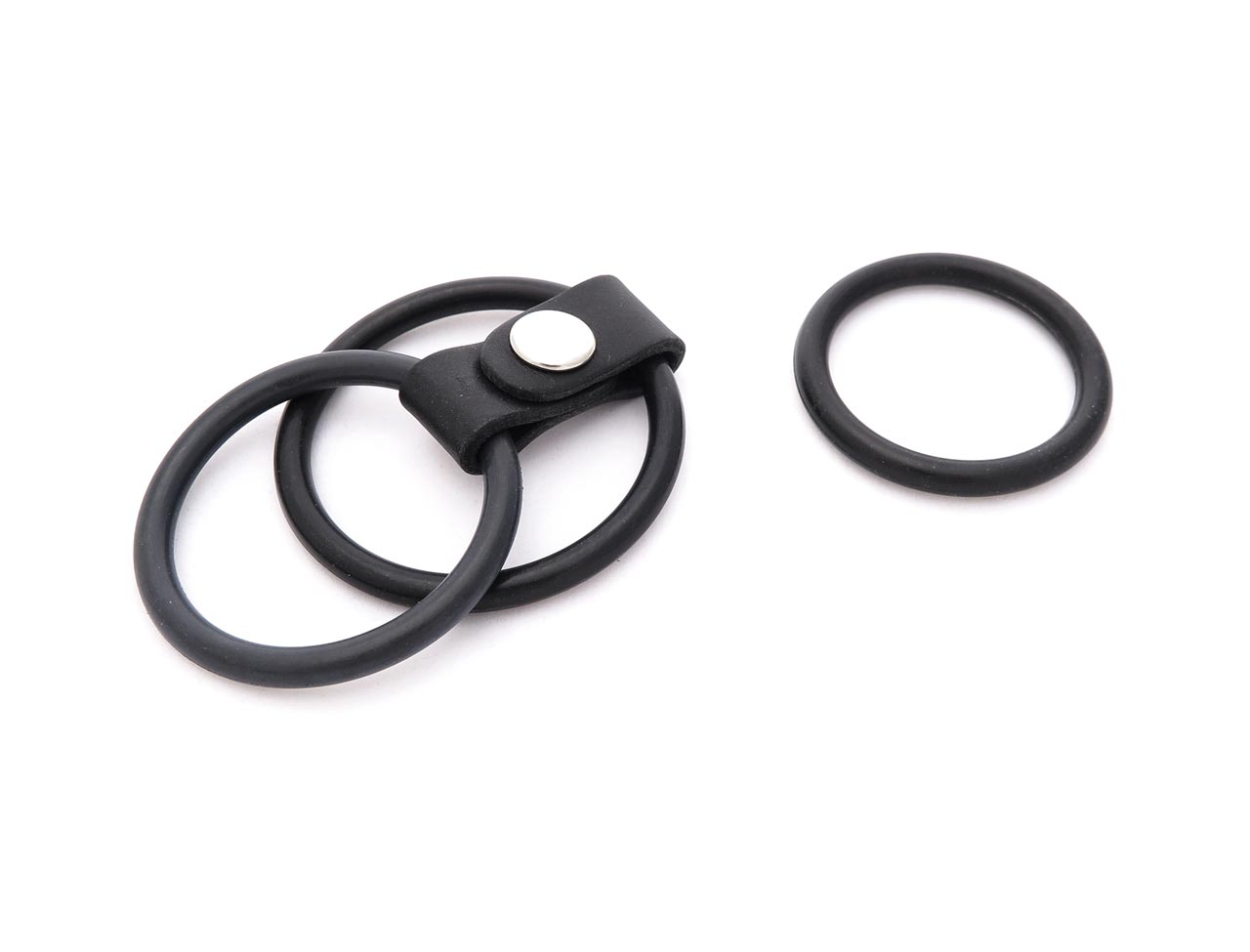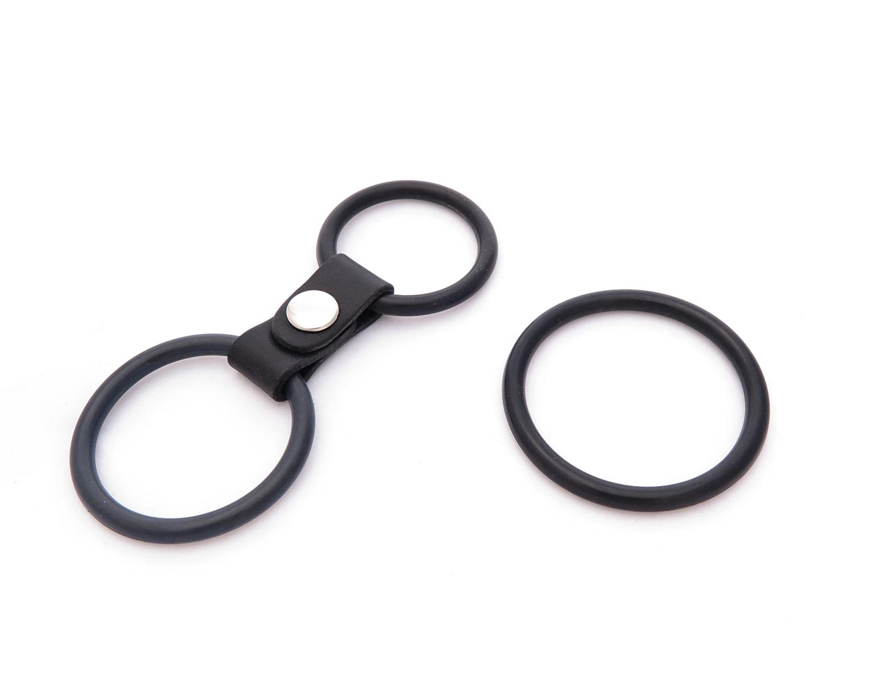 Rubber cock ring with two rings for penis and balls. Place one rubber ring around the base of the shaft and the testicles, with the other around the shaft only.