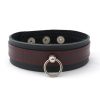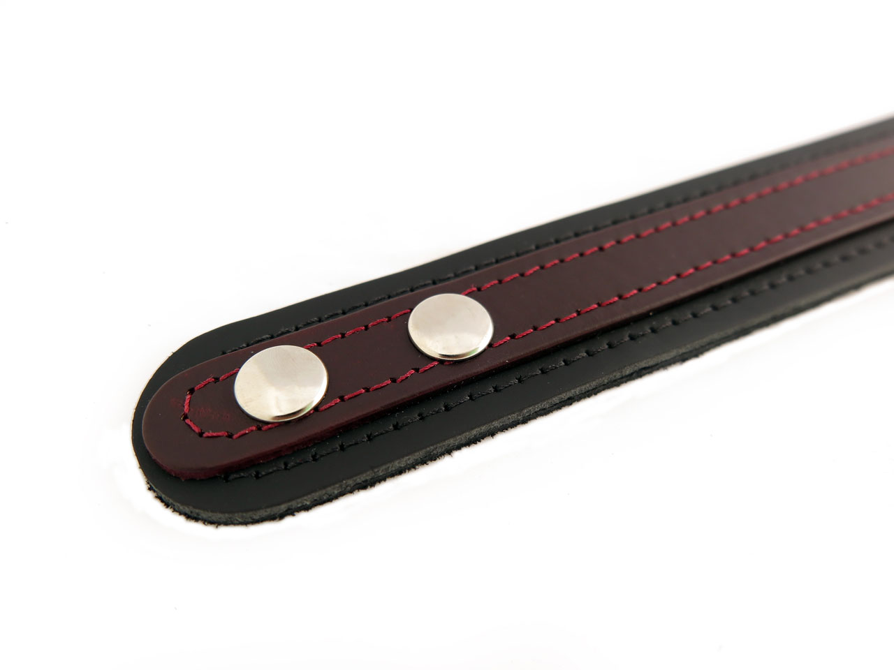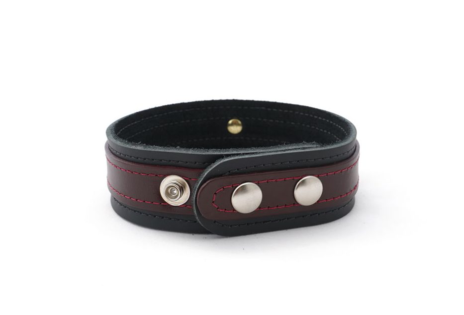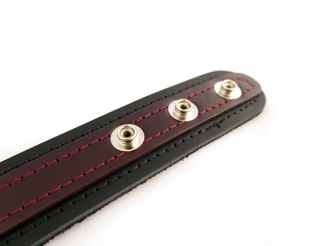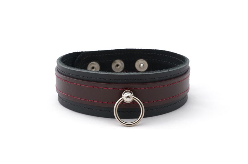 This BDSM collar is made with two layers of premium quality leather, suede lining and double stitching. The outer layer in our signature black cherry colour contrasts beautifully against the inner layer of black leather. It’s suede interior makes this collar soft on the skin and the stitched edges add a refined and elegant final touch.
