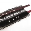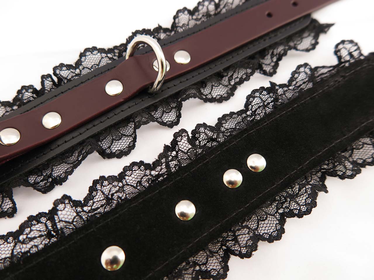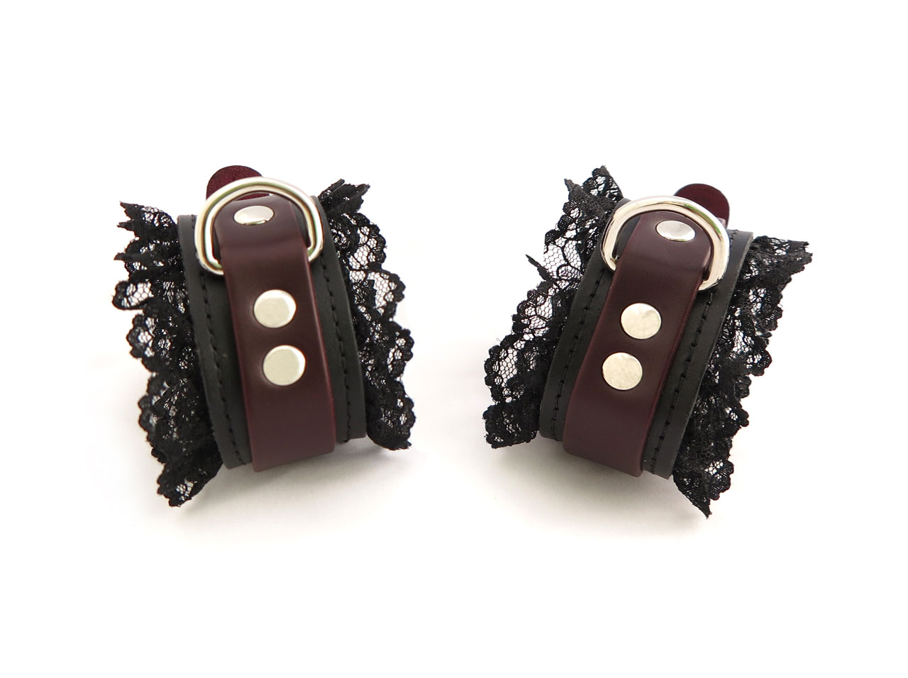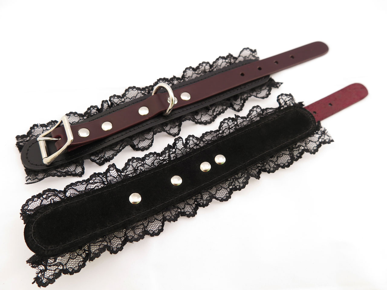 These black lace bondage cuffs come from our signature collection of handcrafted BDSM restraints. Locally made and from our own designs, these leather cuffs are designed with both professionals and fashionistas in mind. They have a double layer of soft and supple buffalo leather, with the outer layer in deep burgundy contrasted by a black inner layer. The interior has a smooth suede lining and they all come together with elegant stitched edges. Black lace detailing offers a sophisticated feminine look to this high class leather cuffs.