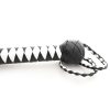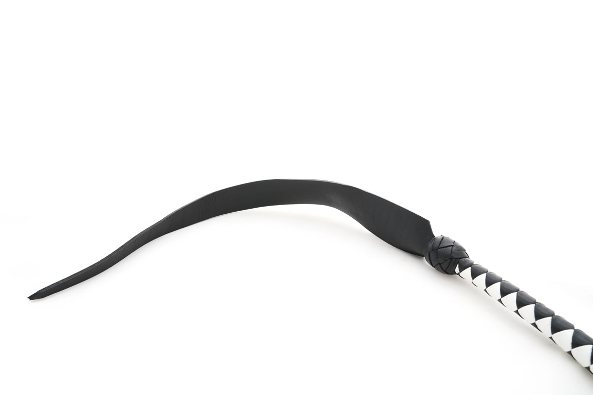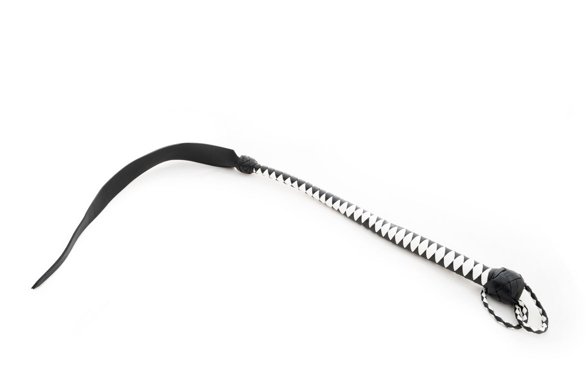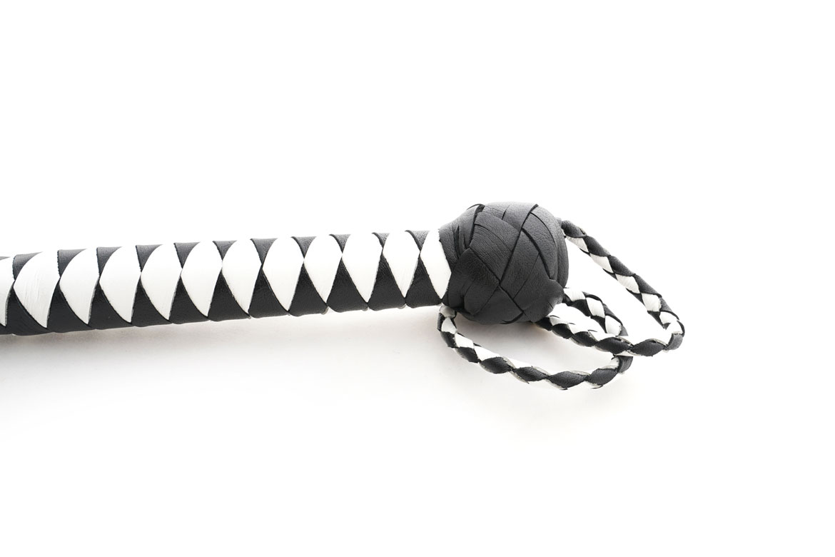 Professional single tail whip or spanking strap in braided black and white leather. Long black tongue narrows at the tip of the fall.