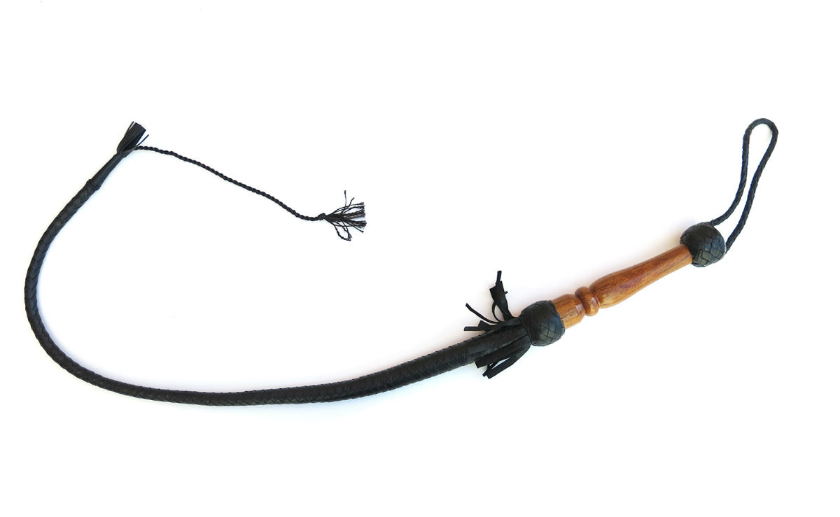 This leather bullwhip has a long length of 100cm. Braided leather that runs from a thick and balanced wooden handle to a thin single tail at the end. Knotted rope that falls off the tip and past the leather gives that extra bit of sharpness and pain for your sub. Professionally made for the esquestrian centers, this bullwhip makes the transition to high quality BDSM play.
