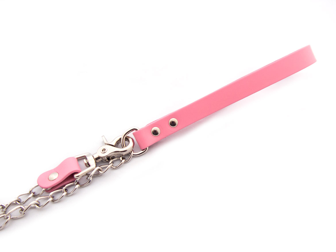 Classic pink bondage leash with a leather handle and 64cm chain. A high quality quick release trigger snap is fastened at the end by a leather attachment and rivets. This means extra tugging power without worry of breakage from your lead. The combination of leather and chain materials make this simple pink bondage leash a superior competitor to most standard leads on the market.