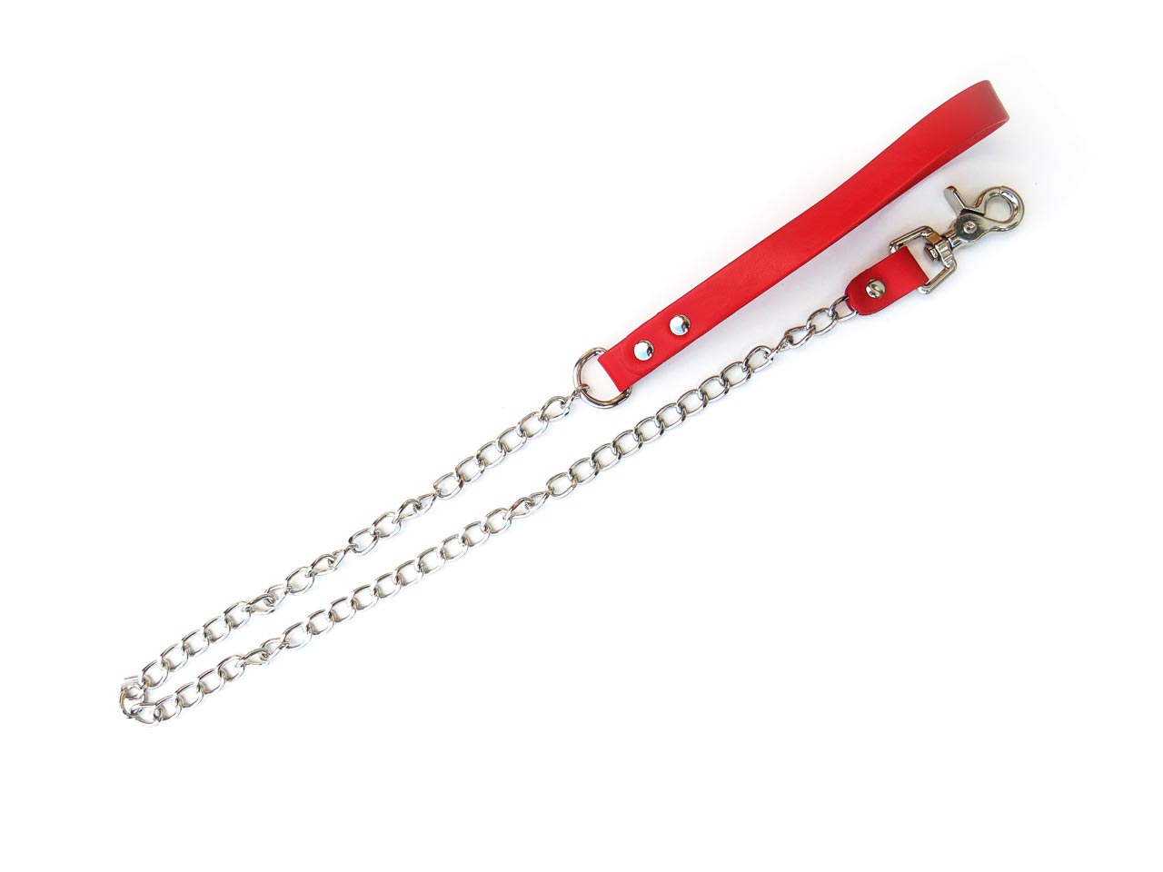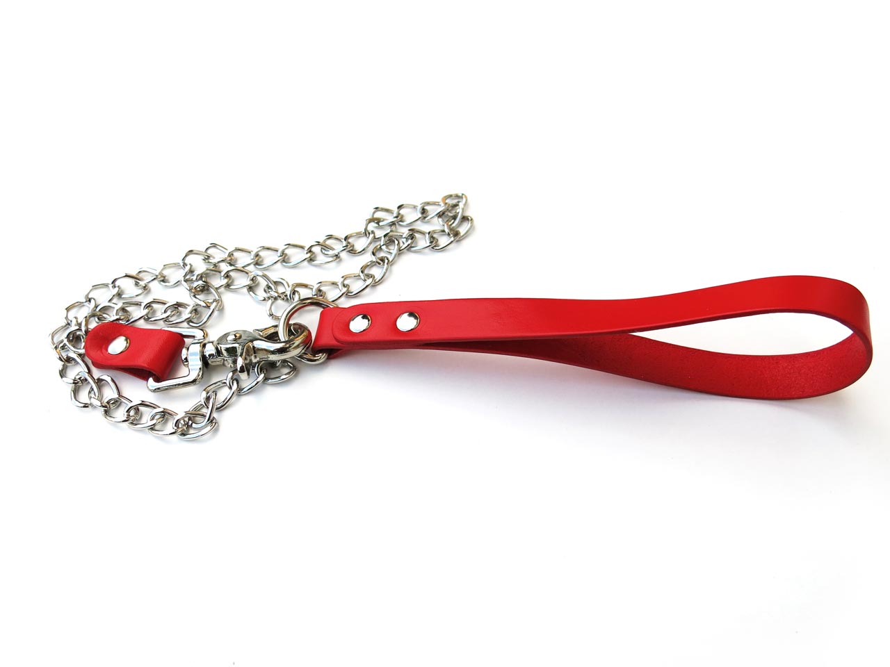 Classic red bondage leash with a leather handle and 64cm chain. A high quality quick release trigger snap is fastened at the end by a leather attachment and rivets. This means extra tugging power without worry of breakage from your lead. The combination of leather and chain materials make this simple red bondage leash a superior competitor to most standard leads on the market.