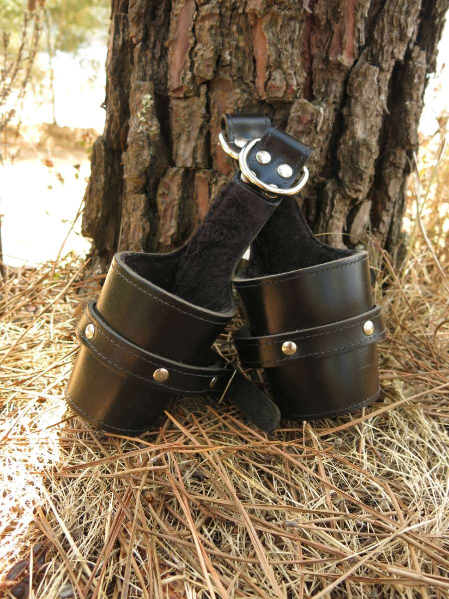 Professional leather suspension cuffs with suede lining for wrist suspension in bondage play and BDSM. Part of our signature collection of handcrafted BDSM restraints. Extra thick (8-9 oz.) buffalo leather gives these cuffs the extra strength needed for proper suspension. Double layered with the suede interior, stitched edges and quality hardware, you can be sure that your submissive will be well secured and enjoying the fun.