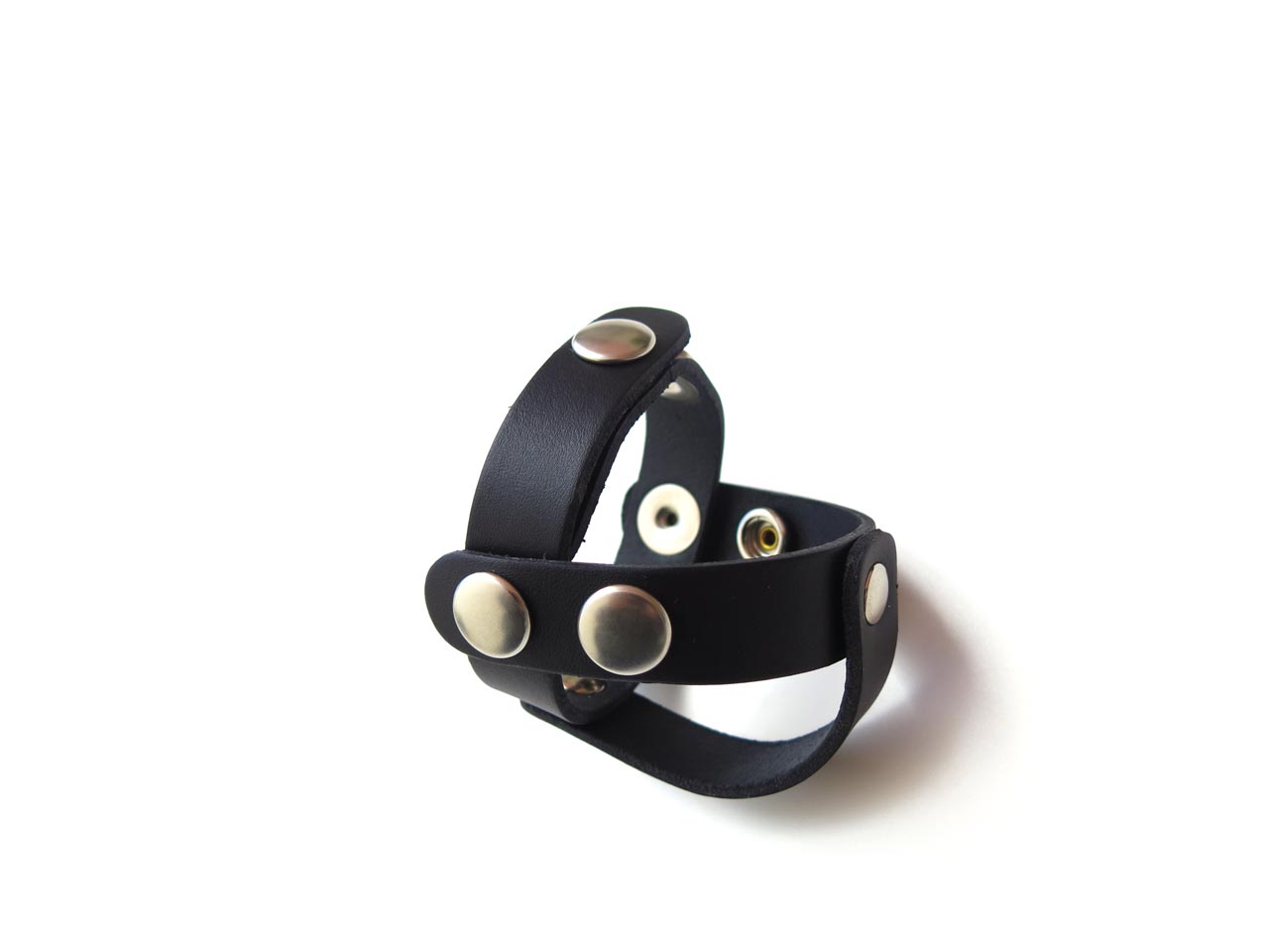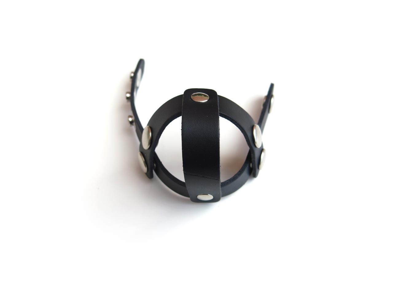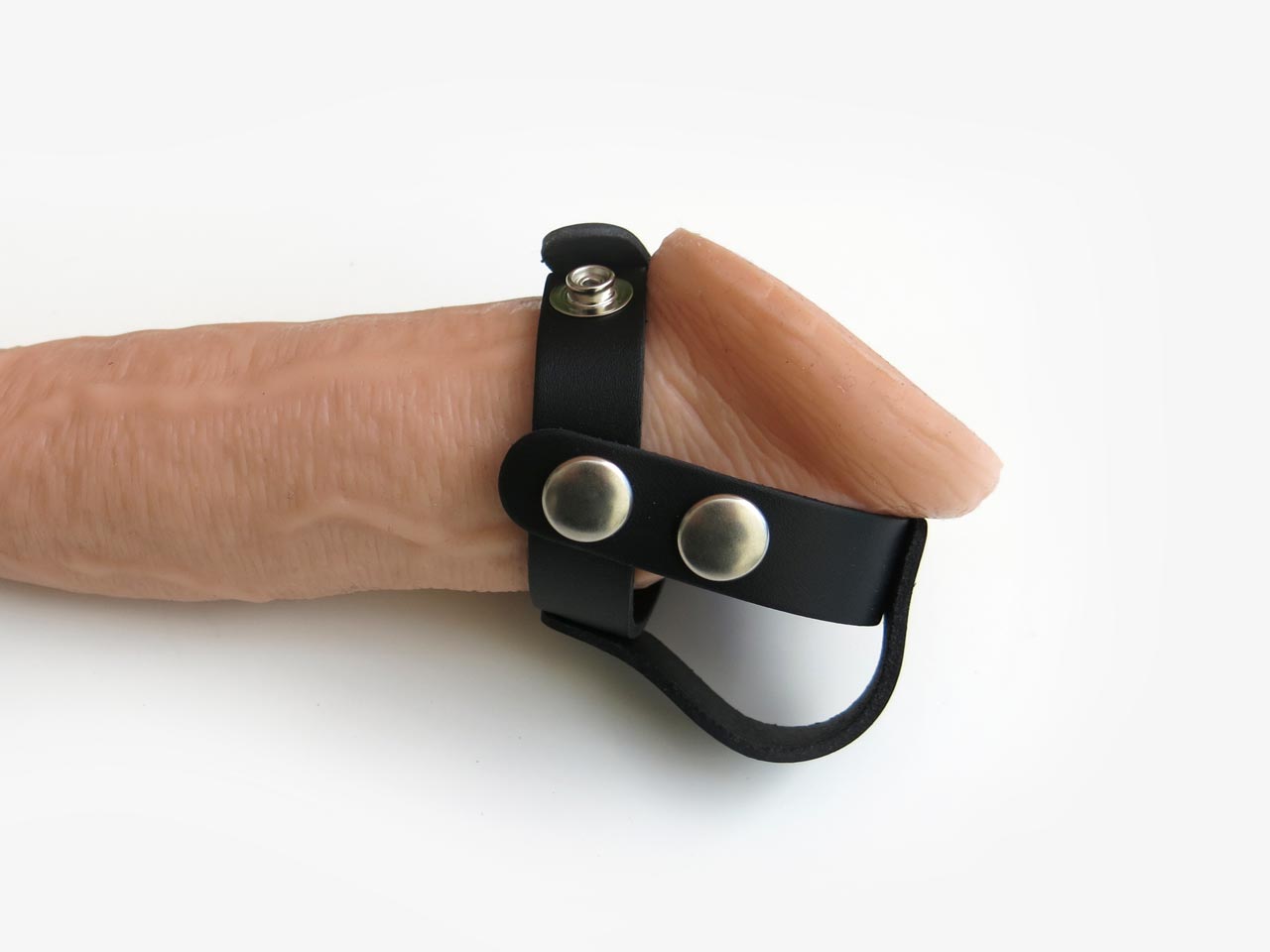 The leather strap around the shaft is adjustable from 44mm to 60mm diameter, accomodating most penises.