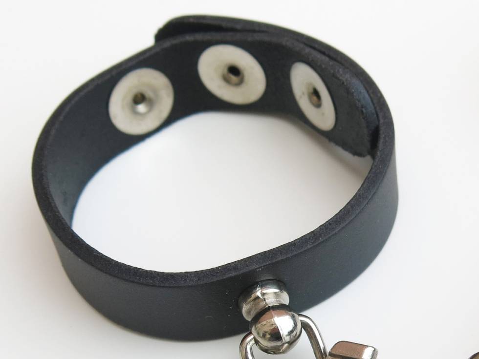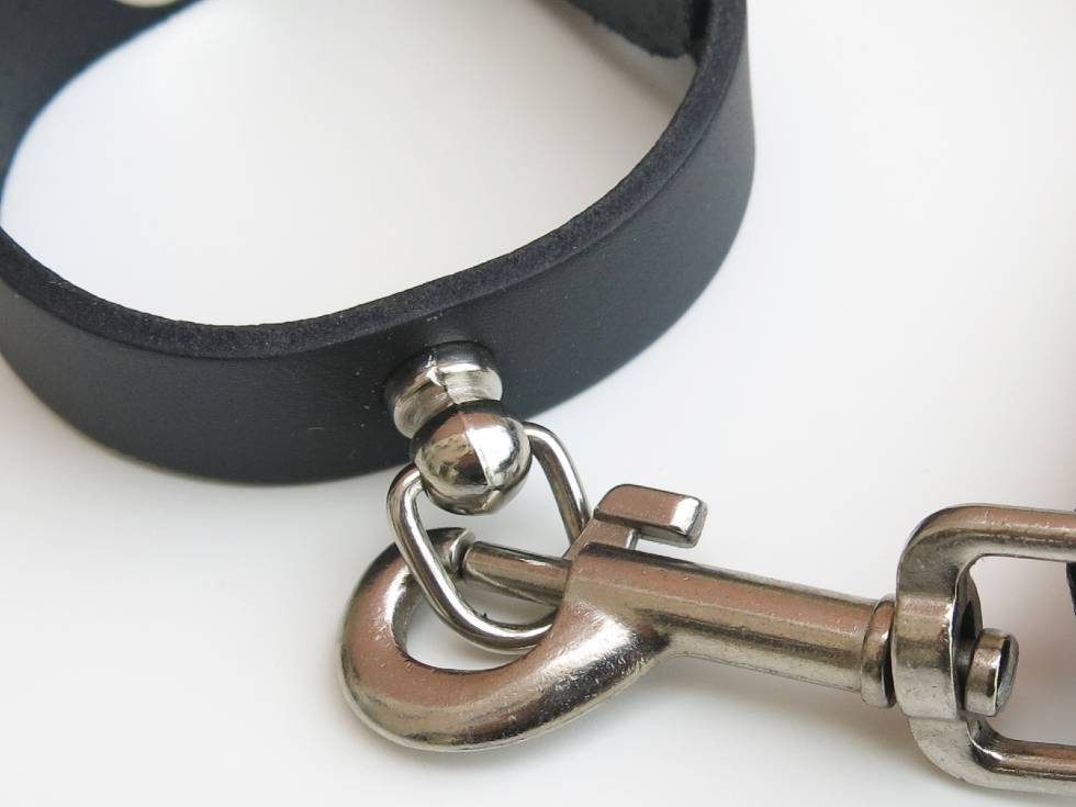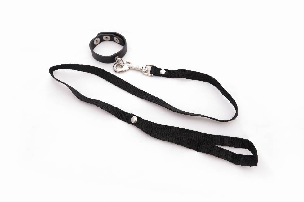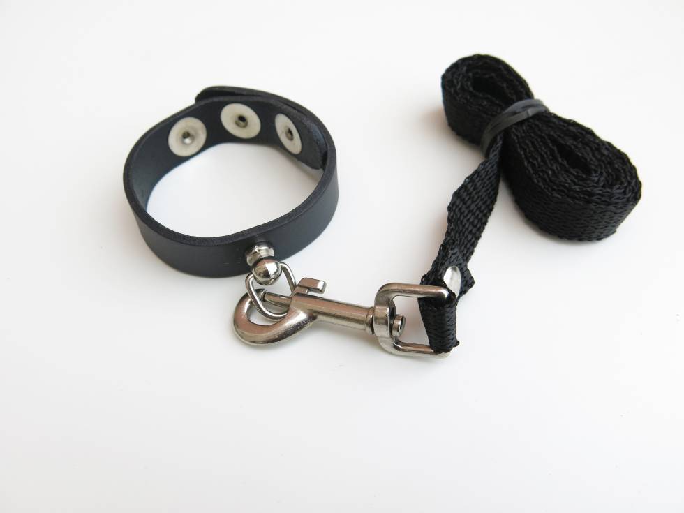 Leather cock ring with leash. Lead is made of webbing with small connector to attach to cockring. Adjustable sizing with snaps. Soft and flexible for the right fit.