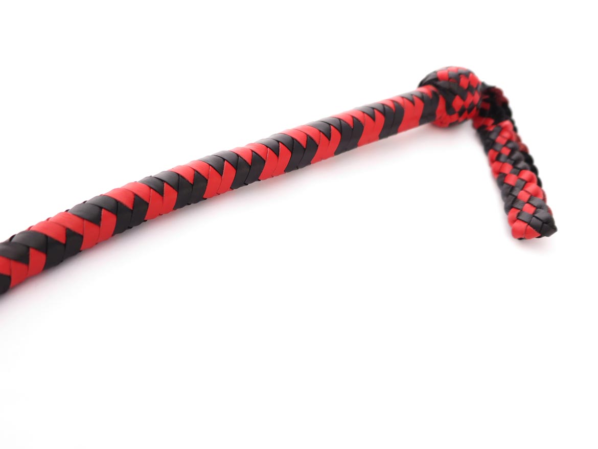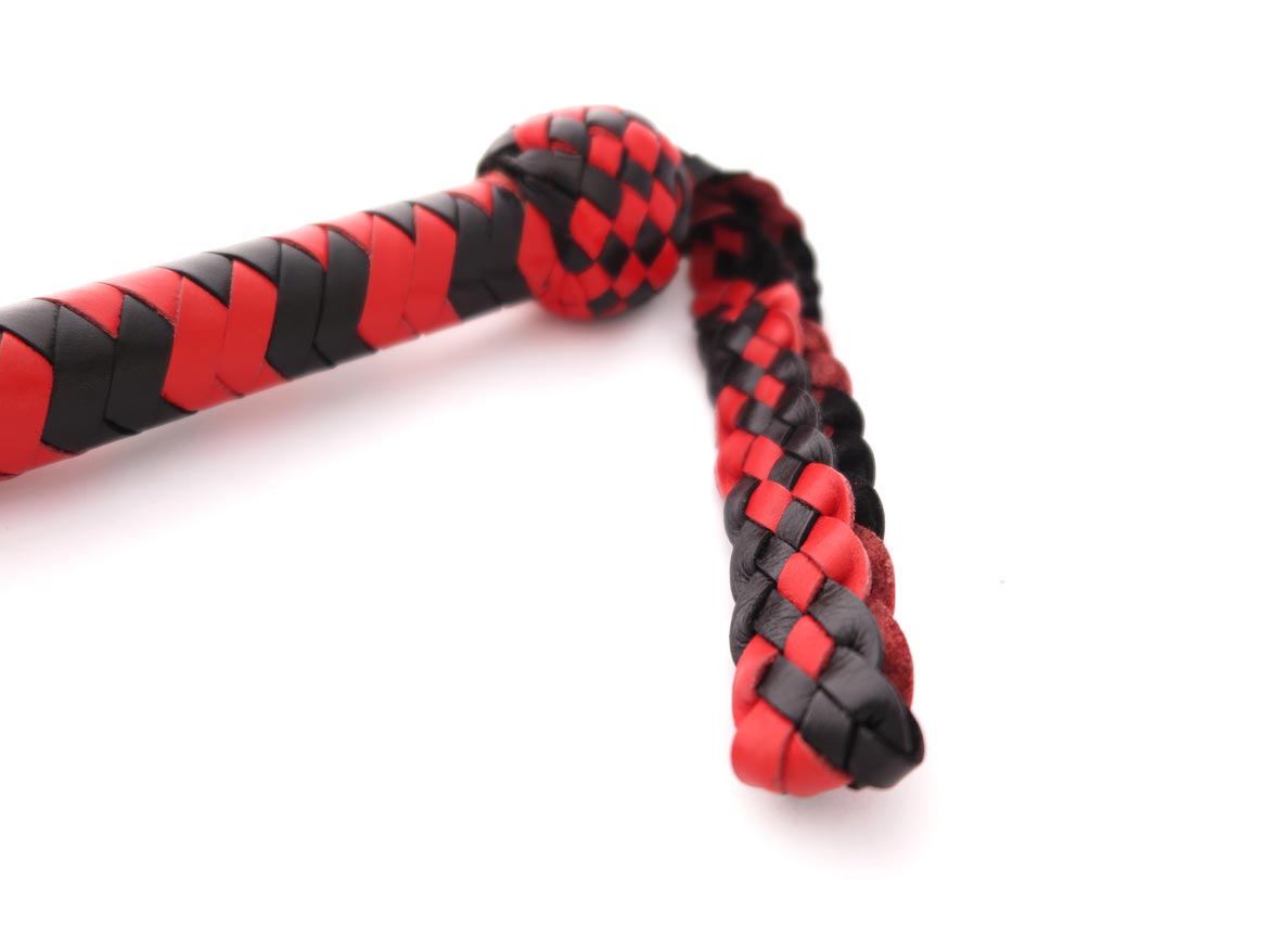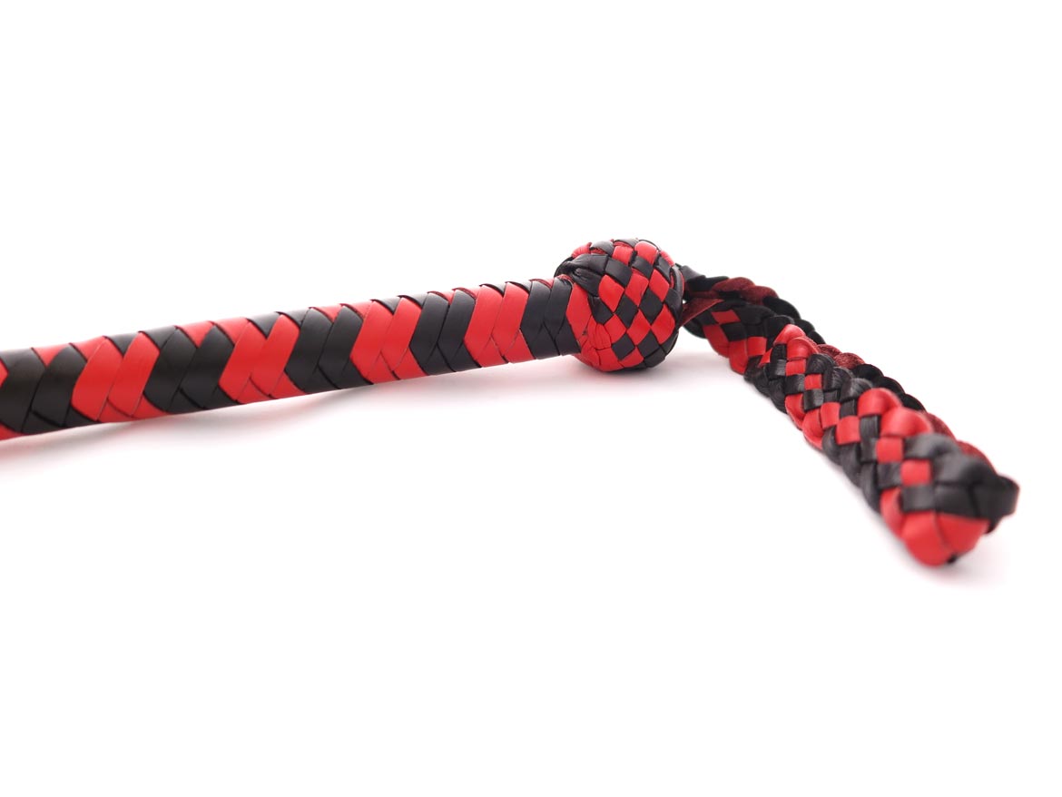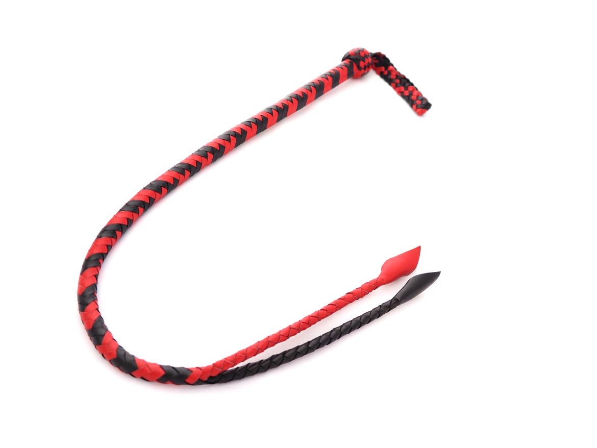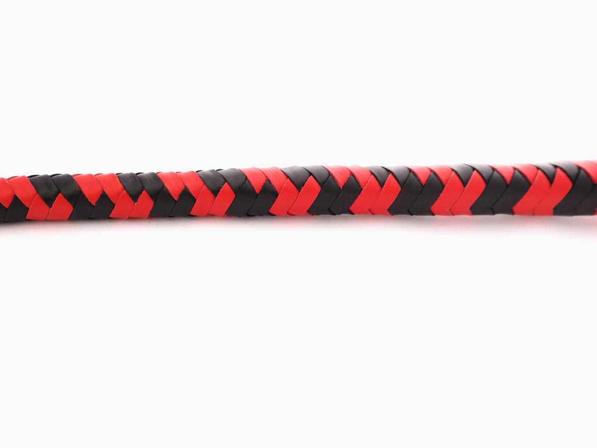 Professional leather snake whip with a long braided handle that divides into two tails towards the end. Leather flaps at the tips give a softer smack. This leather snake whip has interwoven black and red leather with a handle balanced for weight.