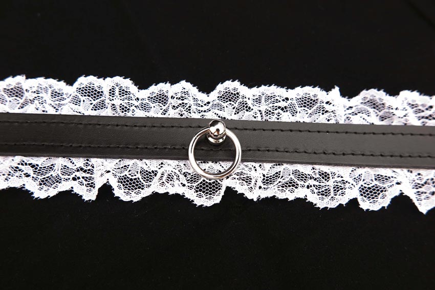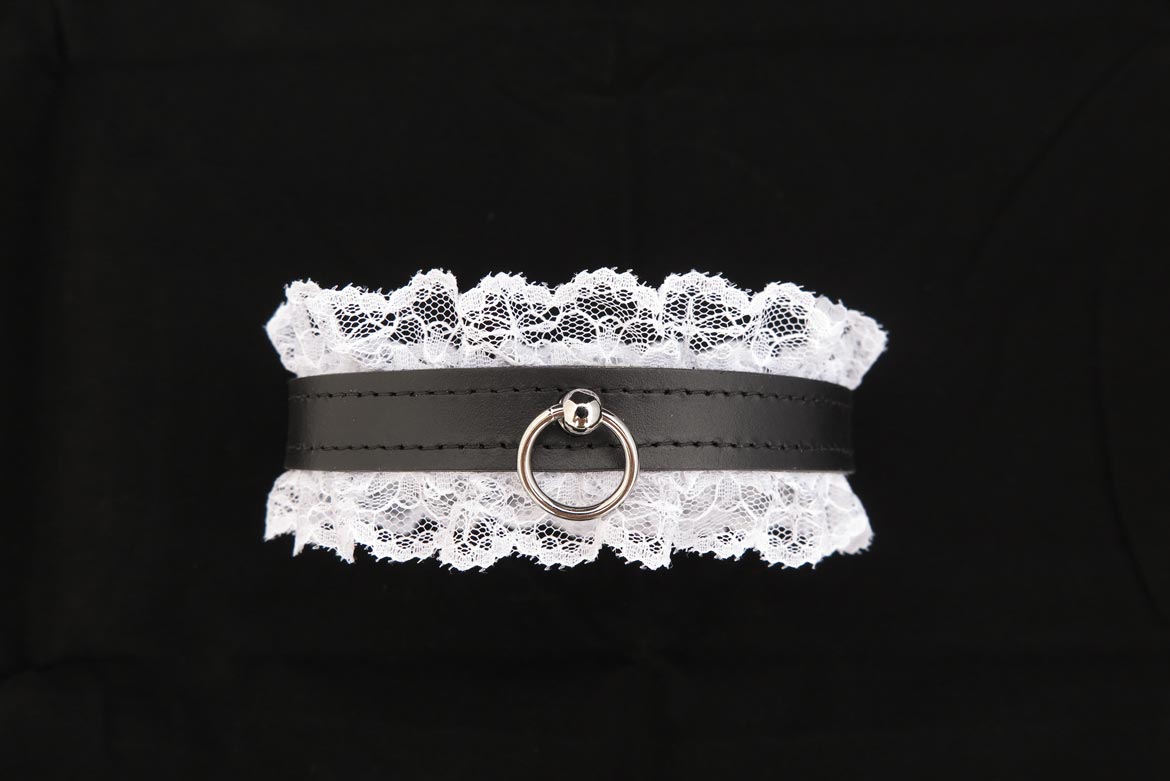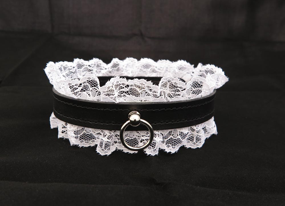 Say hello to leather and lace! This sexy bondage collar from our premium leather collection is made from soft and supple leather and white fabric lace edging. The suede interior makes this collar soft on the skin and the stitched edges add a refined and elegant final touch. Adorned with an o ring for decoration or to attach a lead for light tugging.