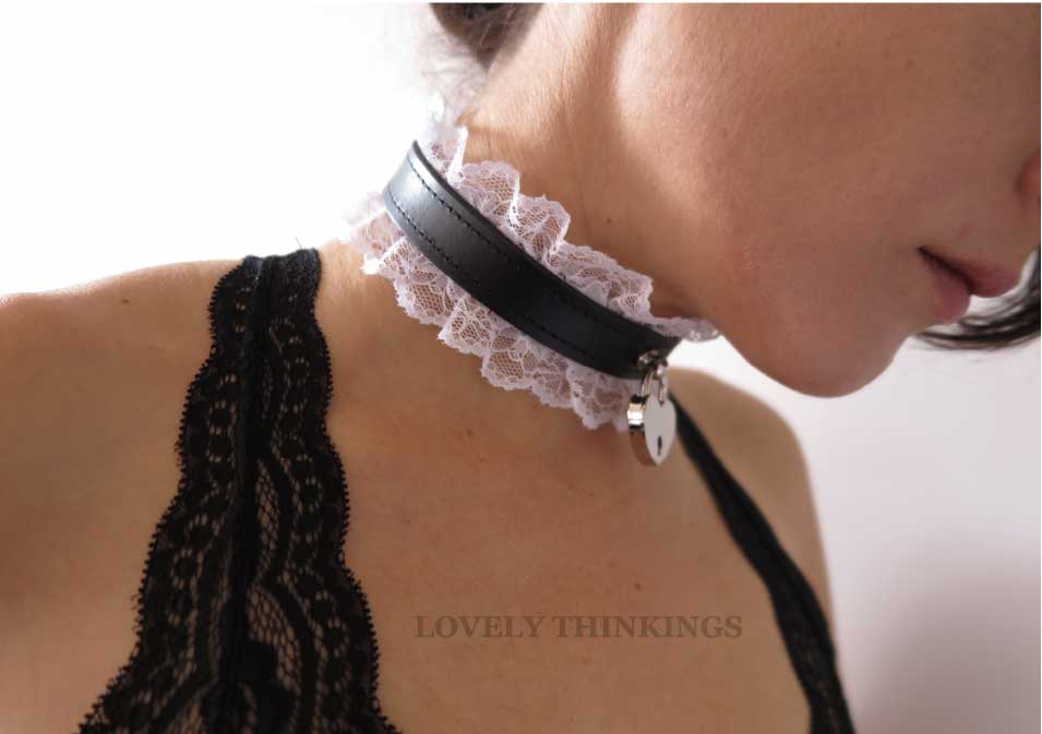 Say hello to leather and lace! This bondage collar from our premium leather collection is made from soft and supple leather and white fabric lace edging. The suede interior makes this collar soft on the skin and the stitched edges add a refined and elegant final touch. A heart lock pendant adorns the front for a submissive feminine touch.