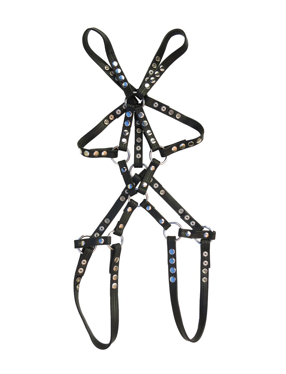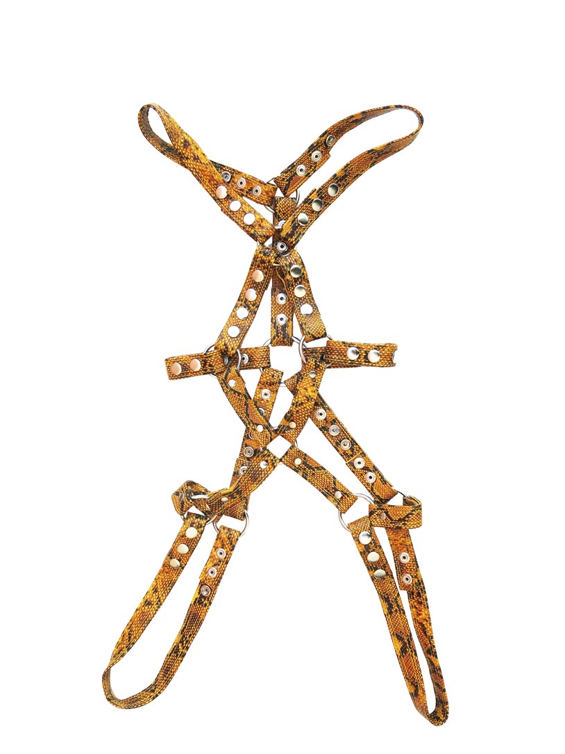 Full body womens harness made with soft and malleable leather for a soft touch to feel comfortable and cozy against the skin. Adjustable sizing on many of the straps with easy to use snaps. Stitched edging gives added depth to this piece, while the leather straps create a beautiful argyle pattern at the front, adding uniqueness to your style.